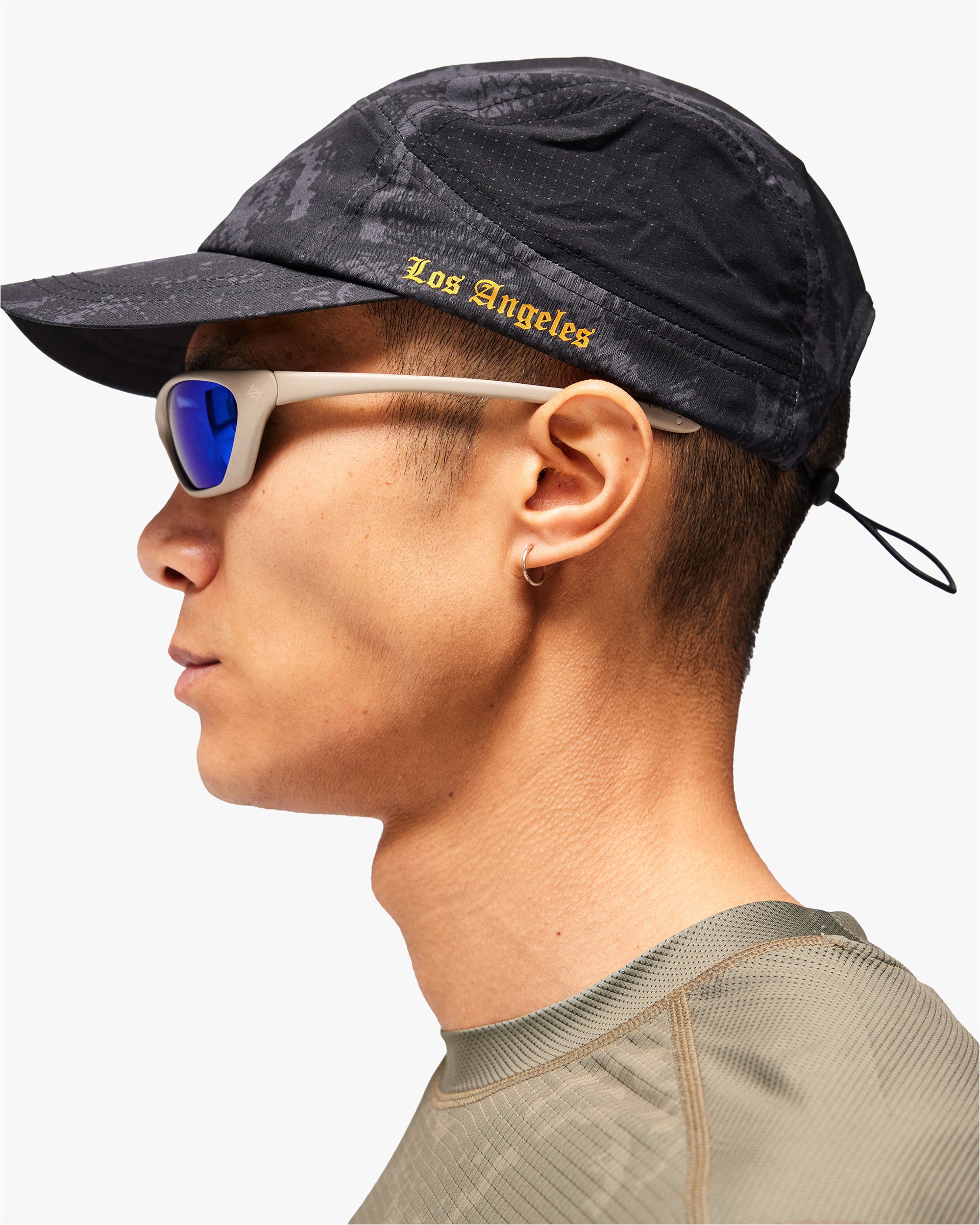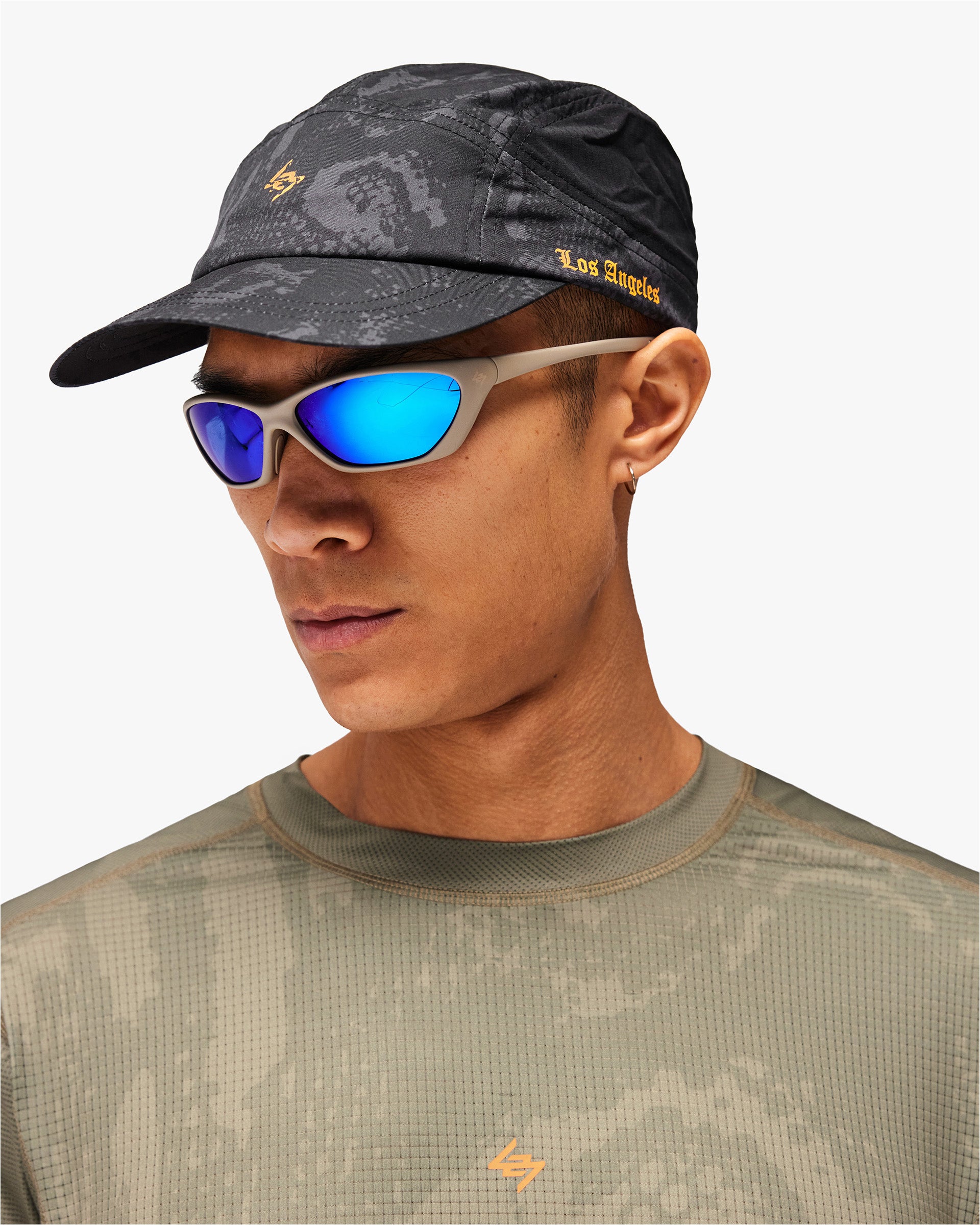 Introducing the 247 Los Angeles Cap. Engineered for distance running in warm conditions, this lightweight five-panel cap features perforated mesh side panels for enhanced airflow and a tonal printed shell for a refined, understated finish. Orange old English embroidery details nod to the collection's West Coast roots, finished with an adjustable rear toggle for a secure, locked-in fit.