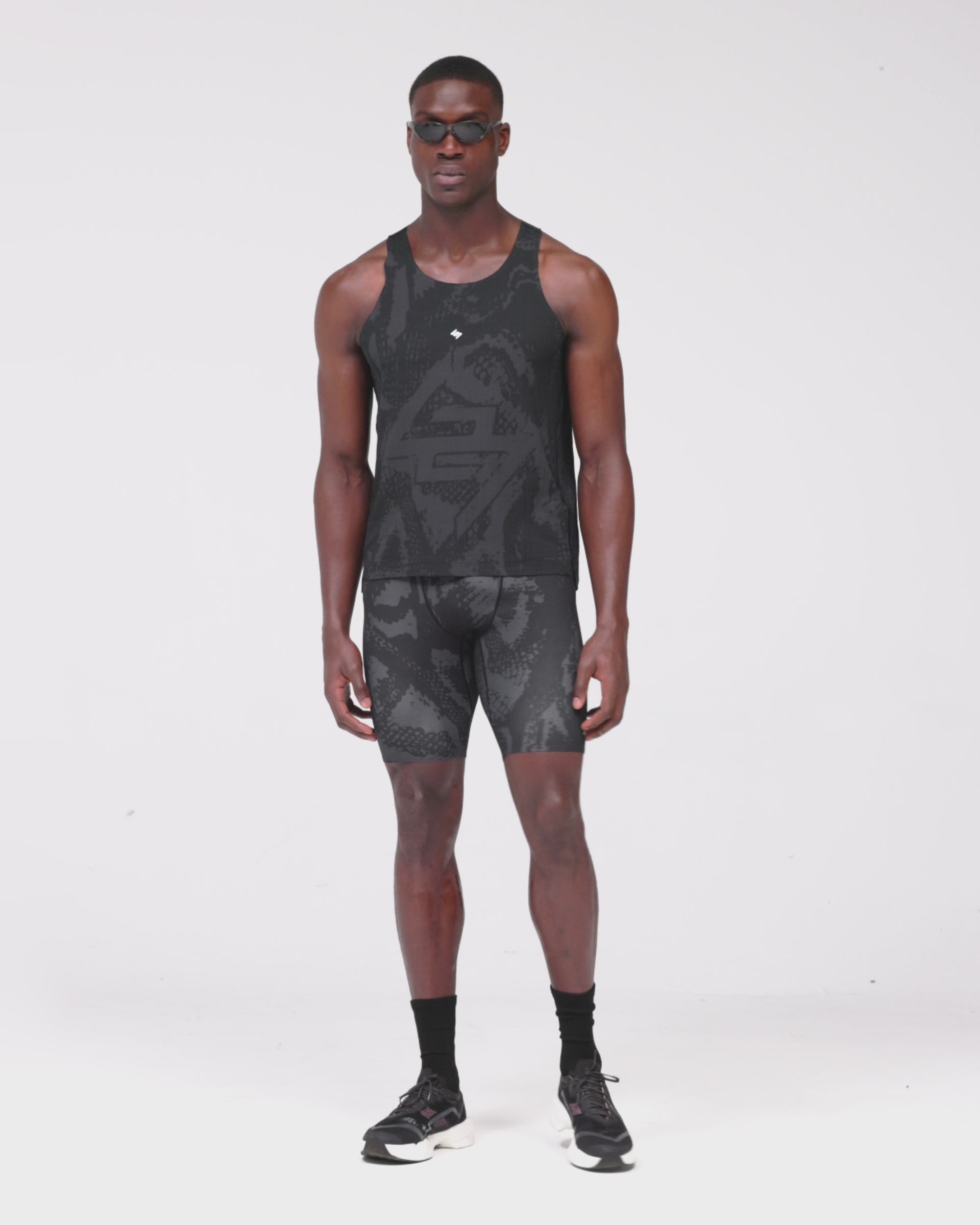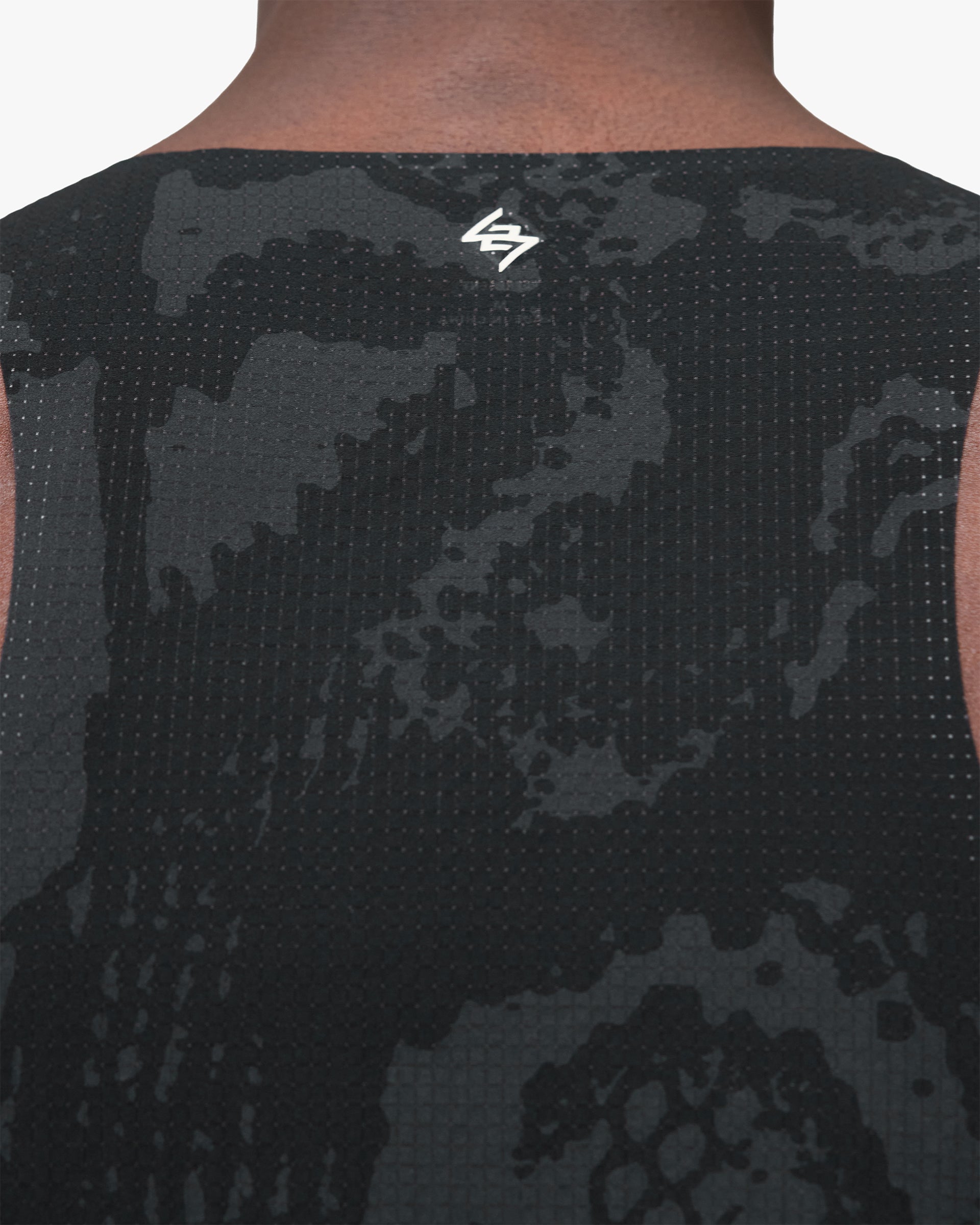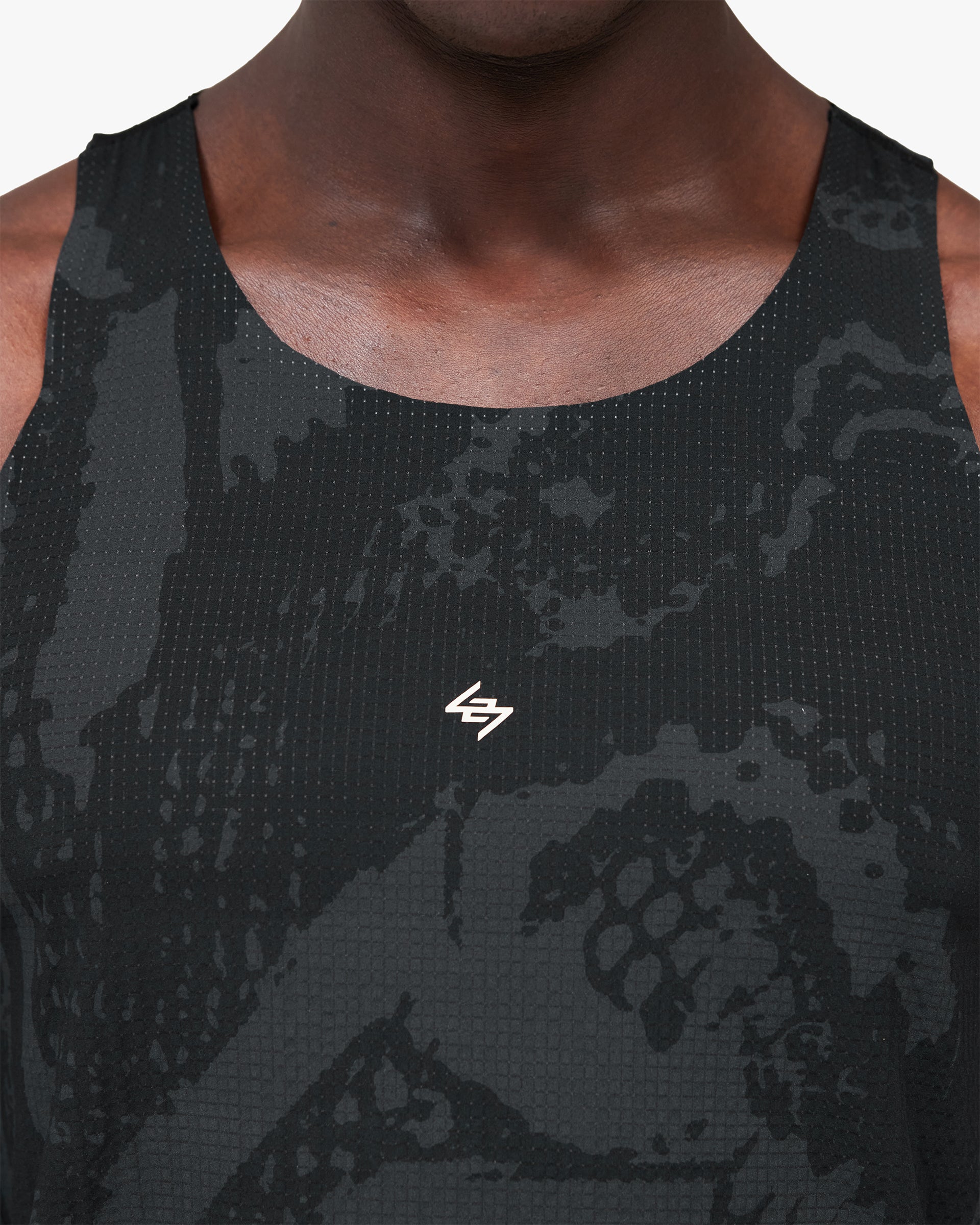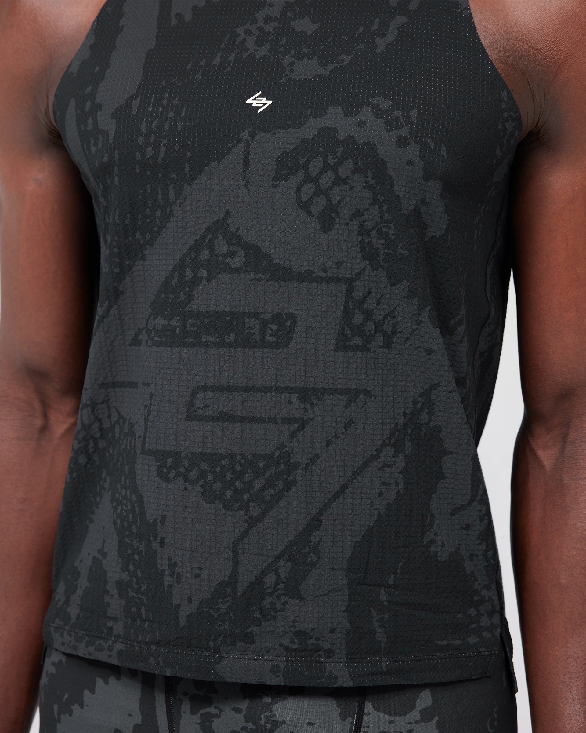 Racerback SilhouetteUnrestricted arm movement for race day performance.Tonal Printed FinishSubtle black-on-black texture detail across the full construction.Mesh Back PanelEnhanced ventilation during high-intensity efforts.Bonded SeamsSmooth, chafe-free comfort from start to finish.