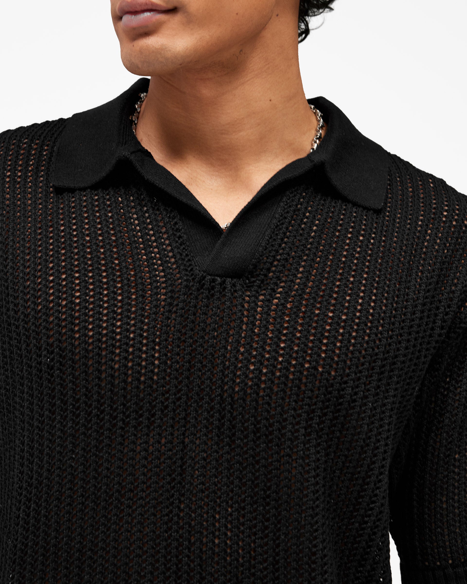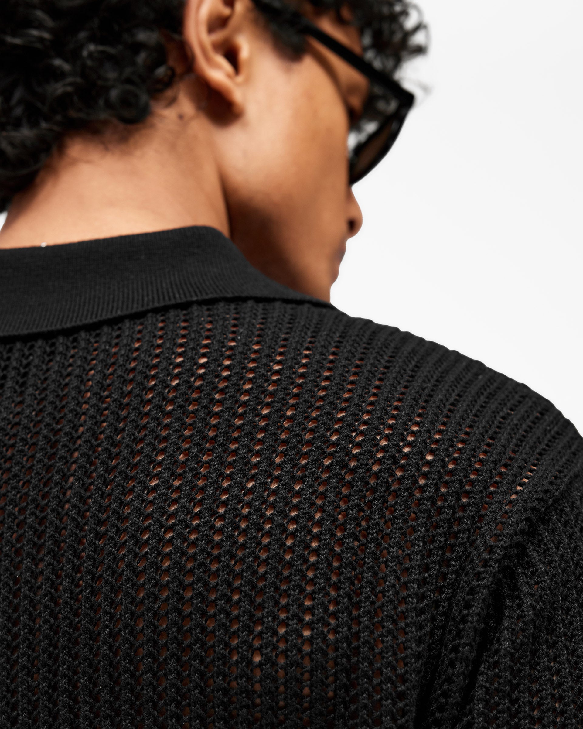 Introducing the Beverly Knit Polo in Jet Black, a refined knitwear essential built from open knit 7GG cotton. This piece arrives with considered detailing: a 1x1 rib knit collar with collar stand, a branded metal bar at the hem, 2x1 rib hem and cuffs, and side splits for ease of movement. The fully linked seams speak to construction integrity, making this a piece designed for longevity.