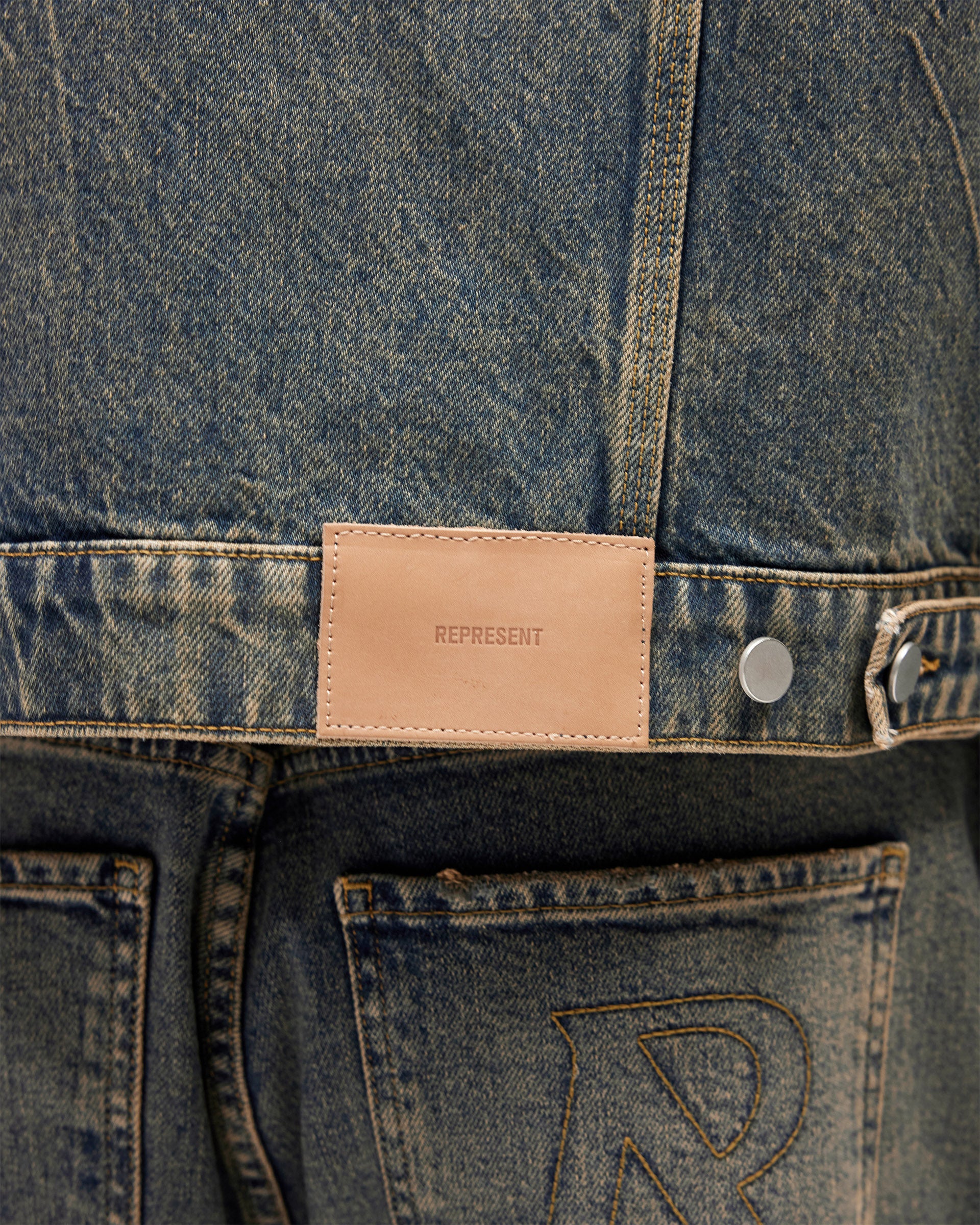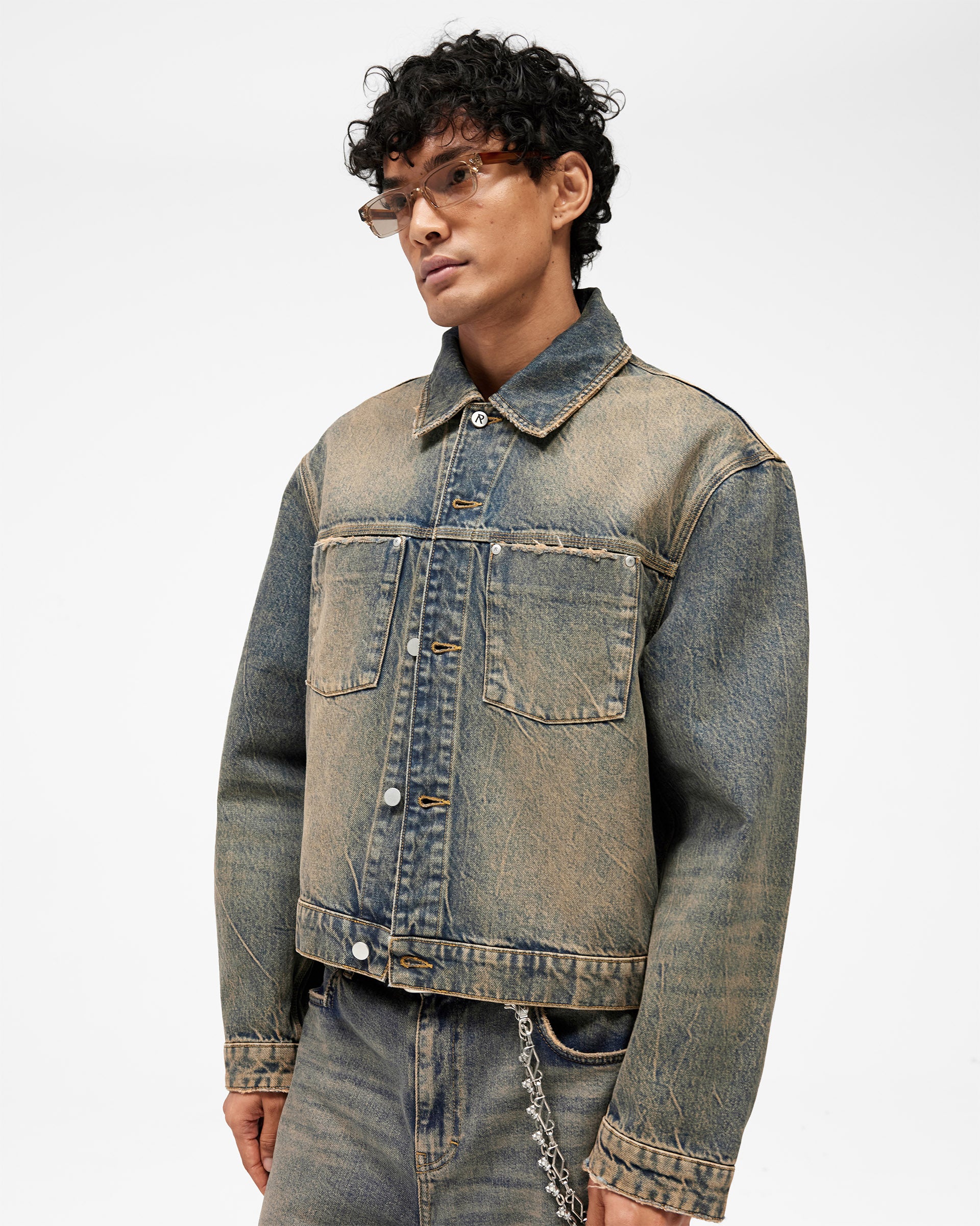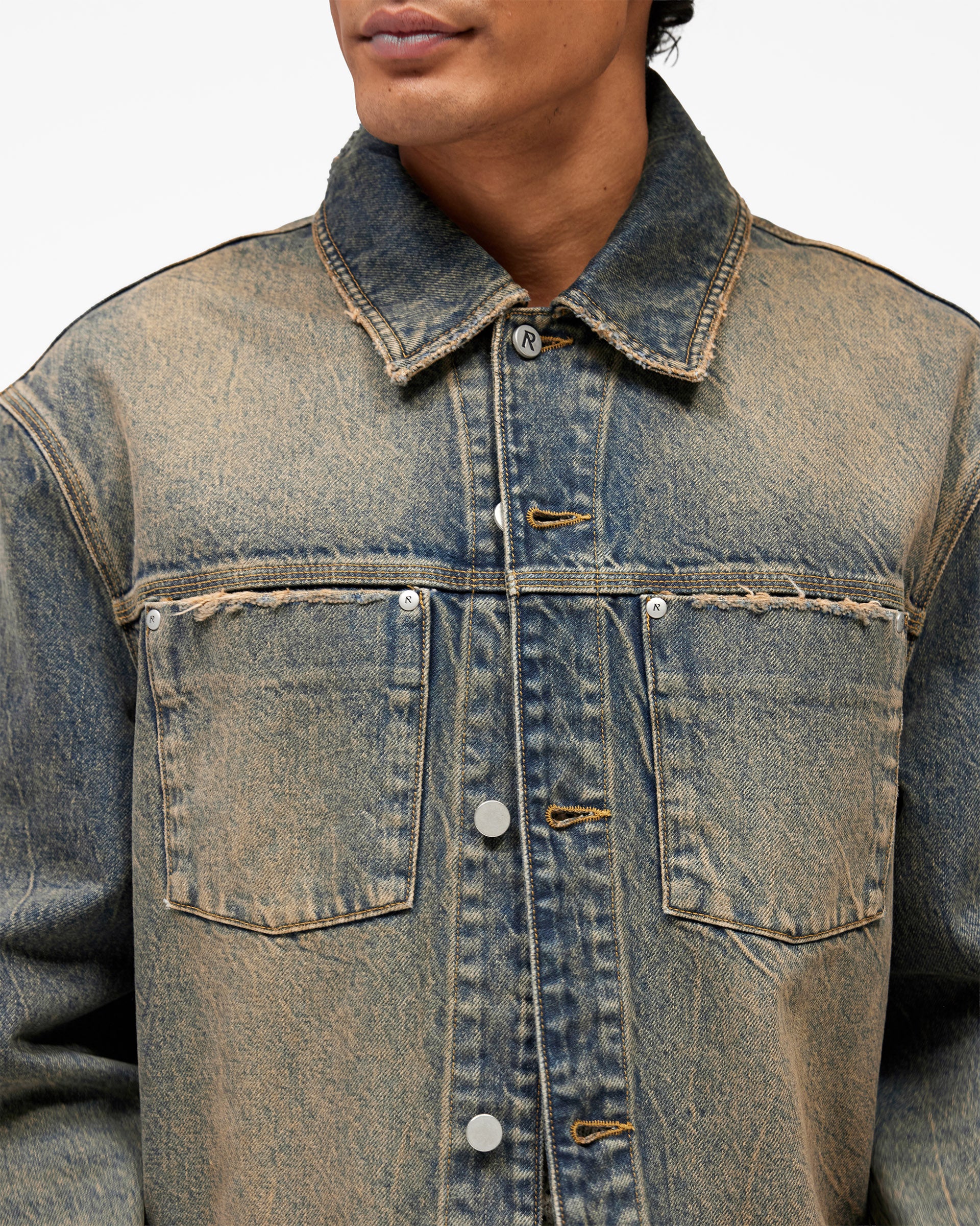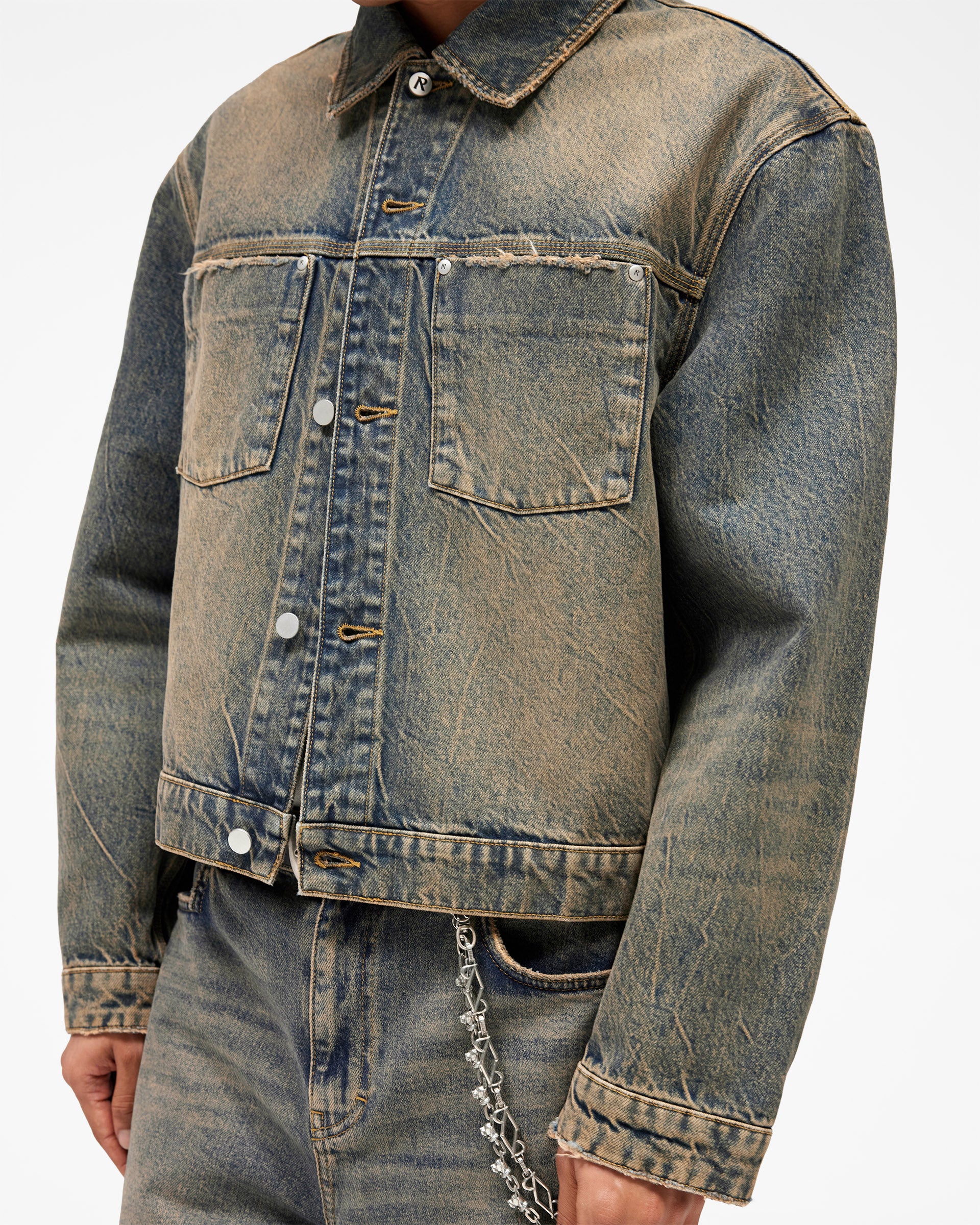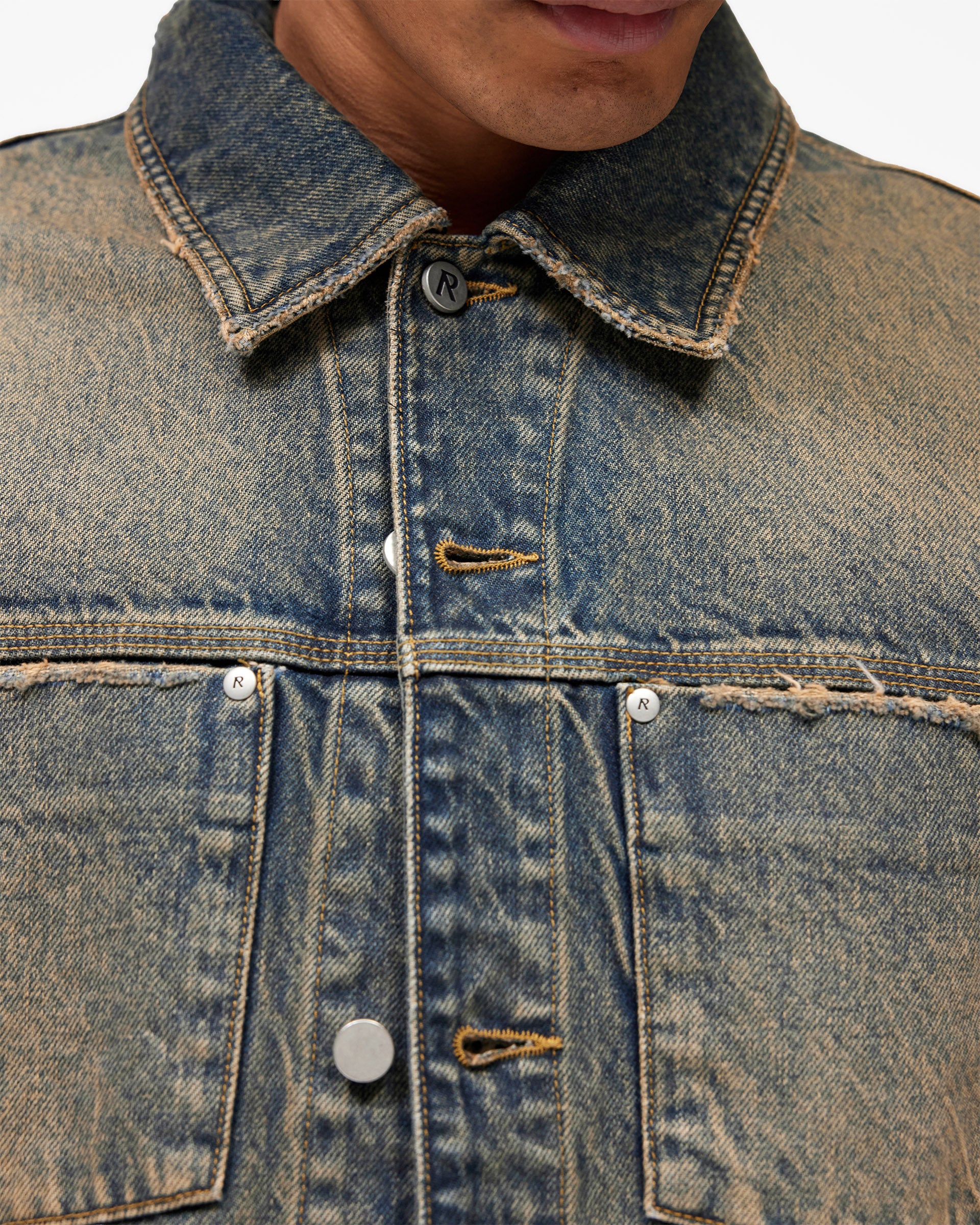 Introducing the Denim Trucker in Blue Cream, a classic trucker jacket crafted from rigid cotton denim with a heavily distressed vintage wash. The two-tone blue and cream finish is developed through intensive washing to create a naturally aged, worn-in character that will continue to develop over time.