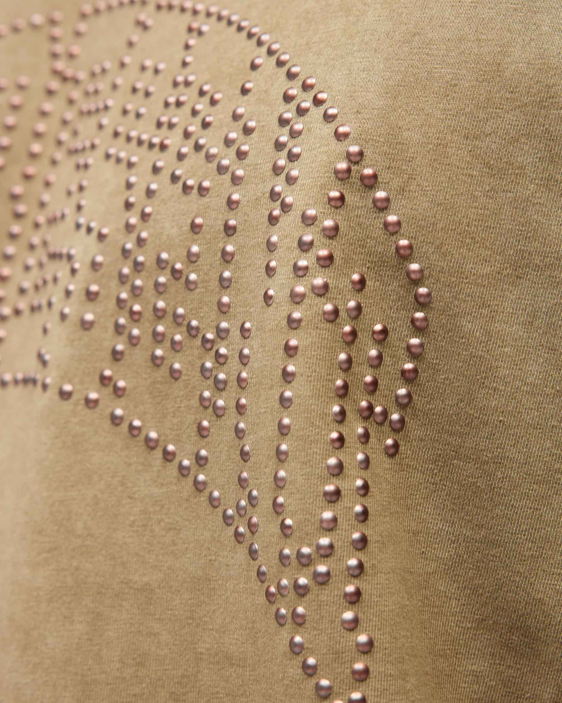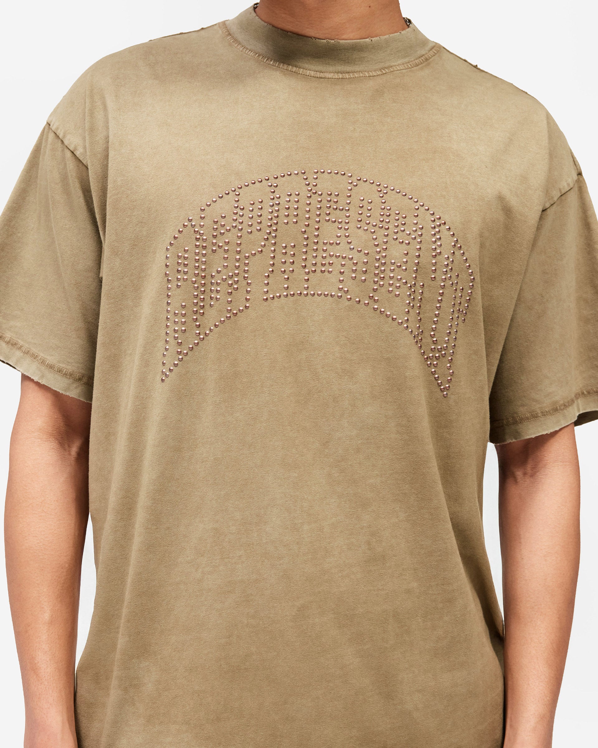 Introducing the Embellished Represent T-Shirt in Vintage Khaki, an oversized t-shirt crafted from heavyweight cotton jersey with a washed vintage finish. The front features the arched Represent logo rendered in individual metal claw studs, sitting tonal against the khaki base for a subtle, textured effect.