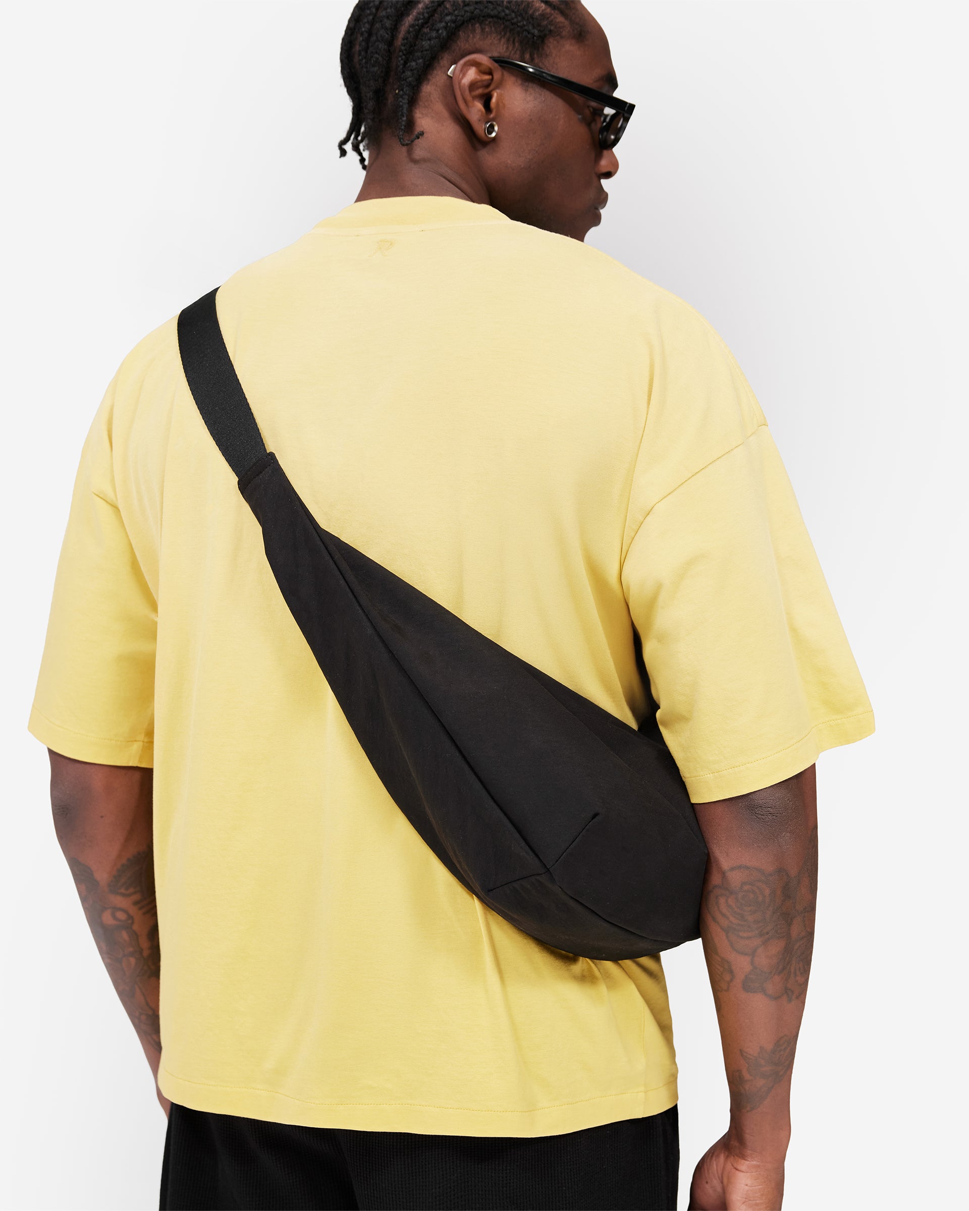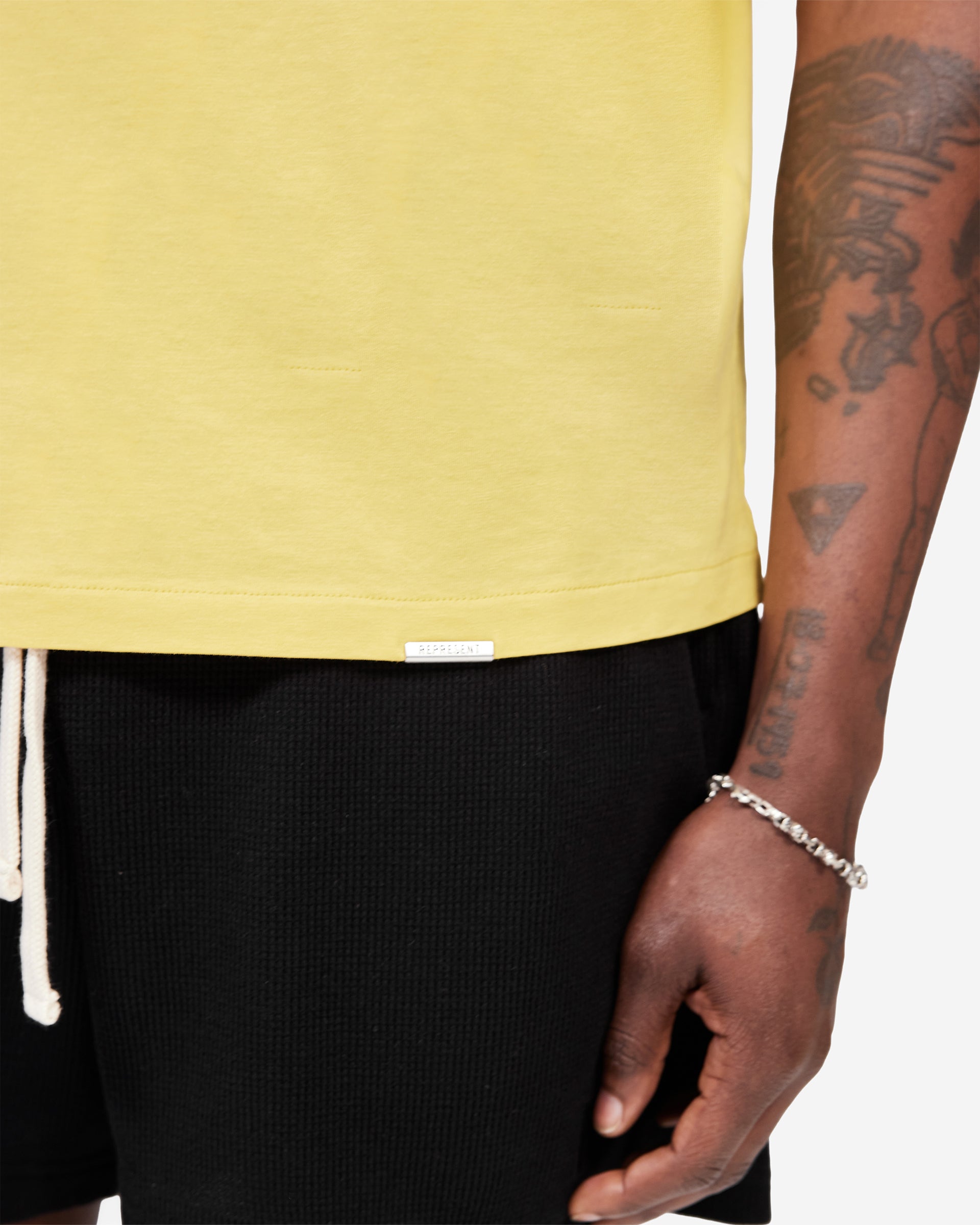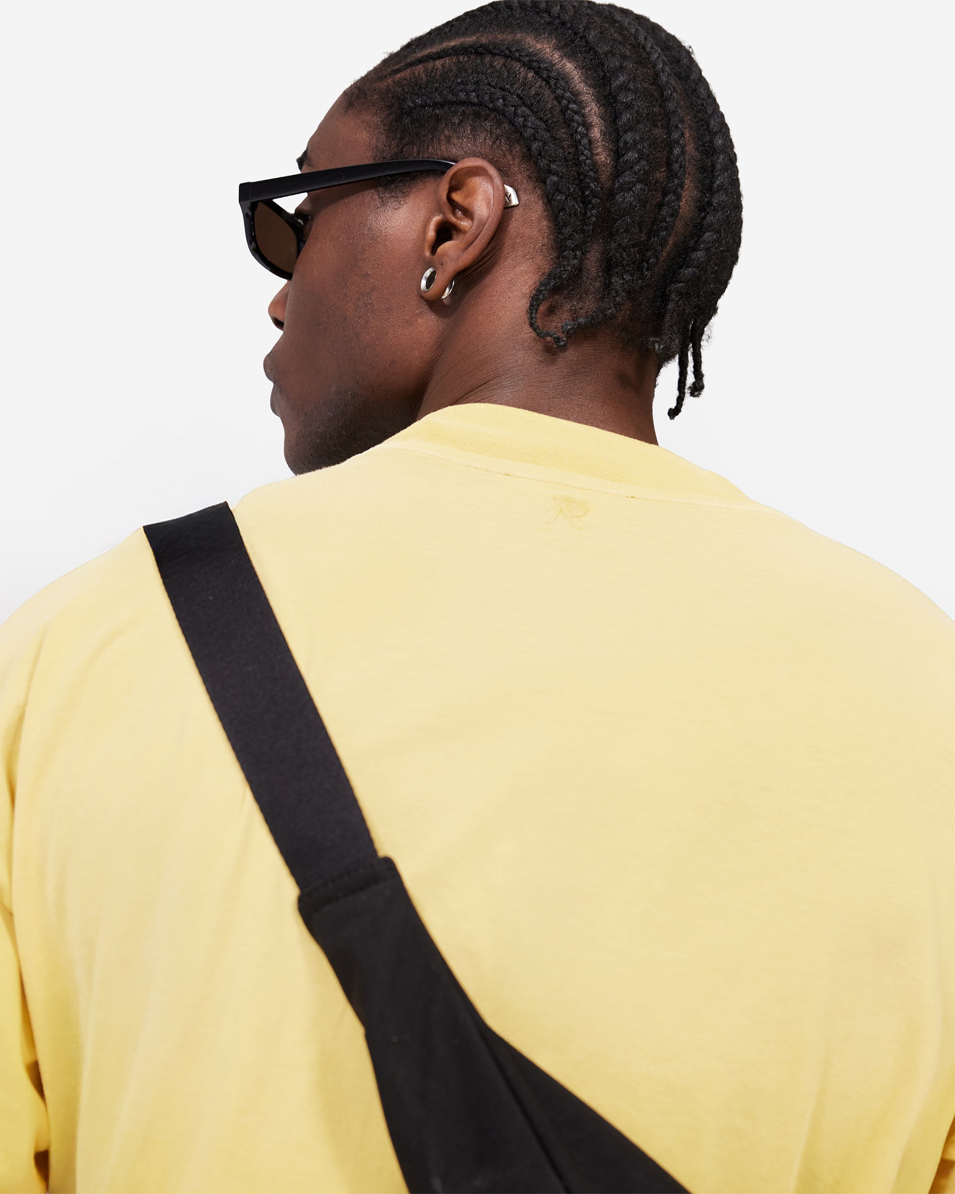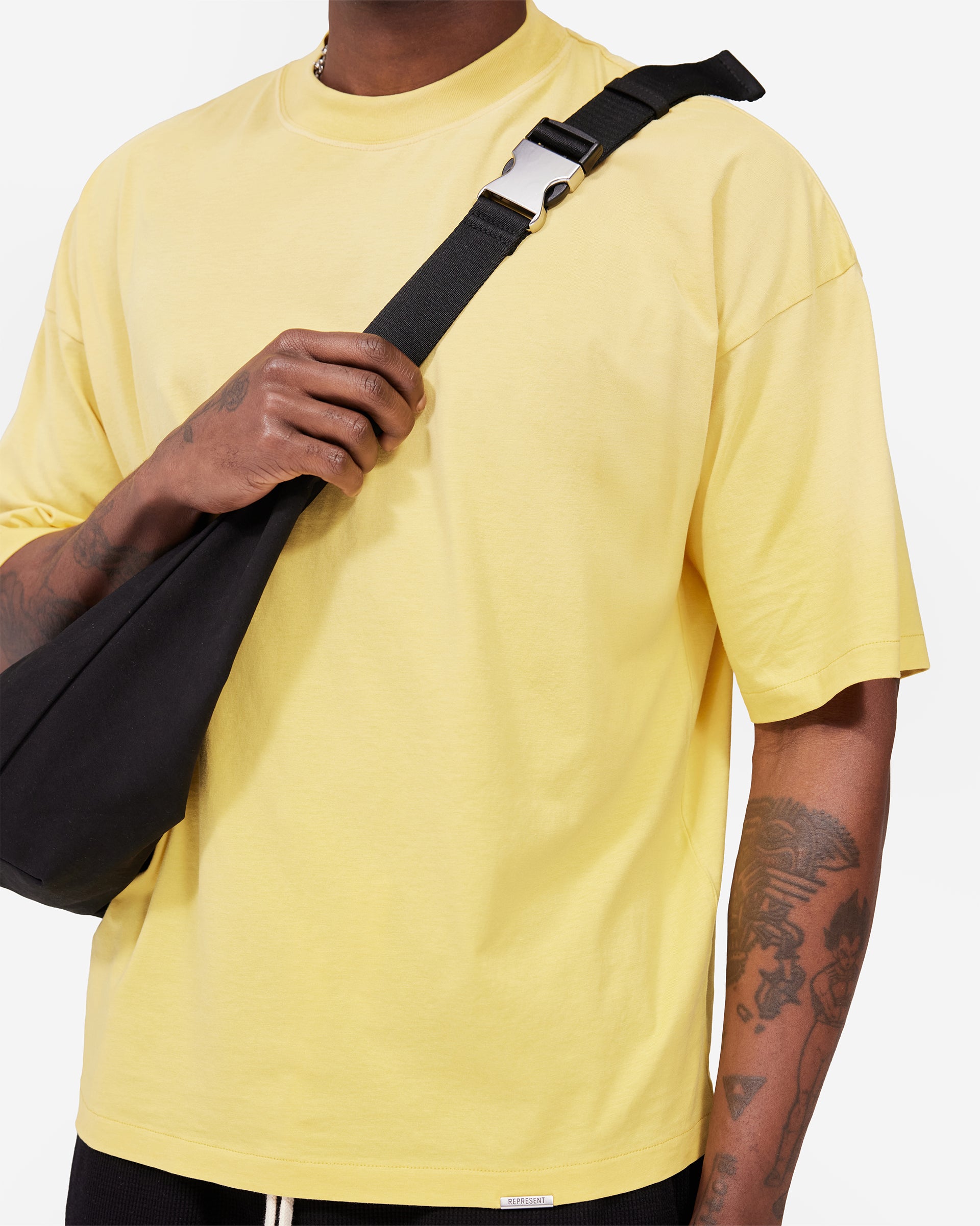 Introducing the Initial Boxy T-Shirt in Canary Yellow, a boxy short sleeve crafted from 140gsm cotton jersey with a pigment spray wash for a vibrant, textured finish. The wider, squared silhouette with dropped shoulders delivers a contemporary shape built for effortless everyday styling.