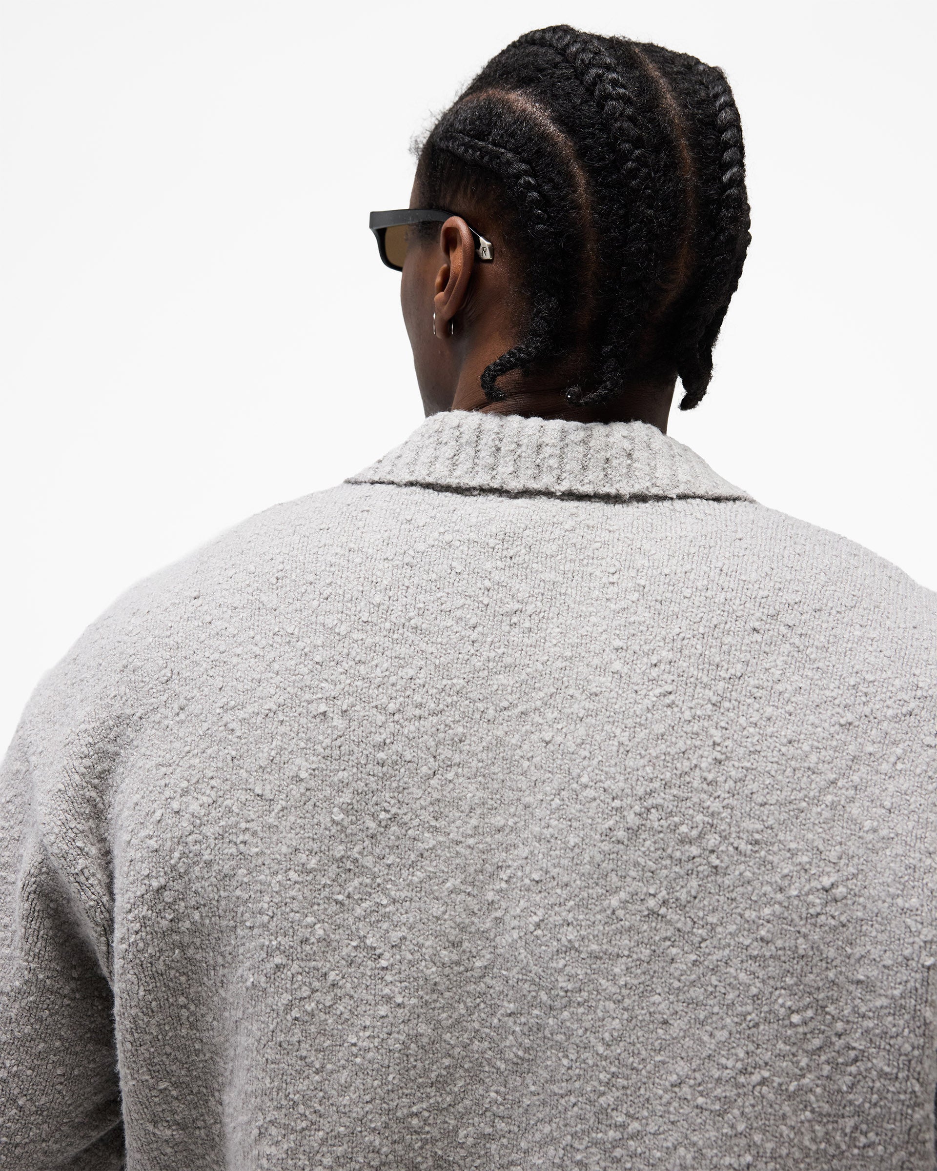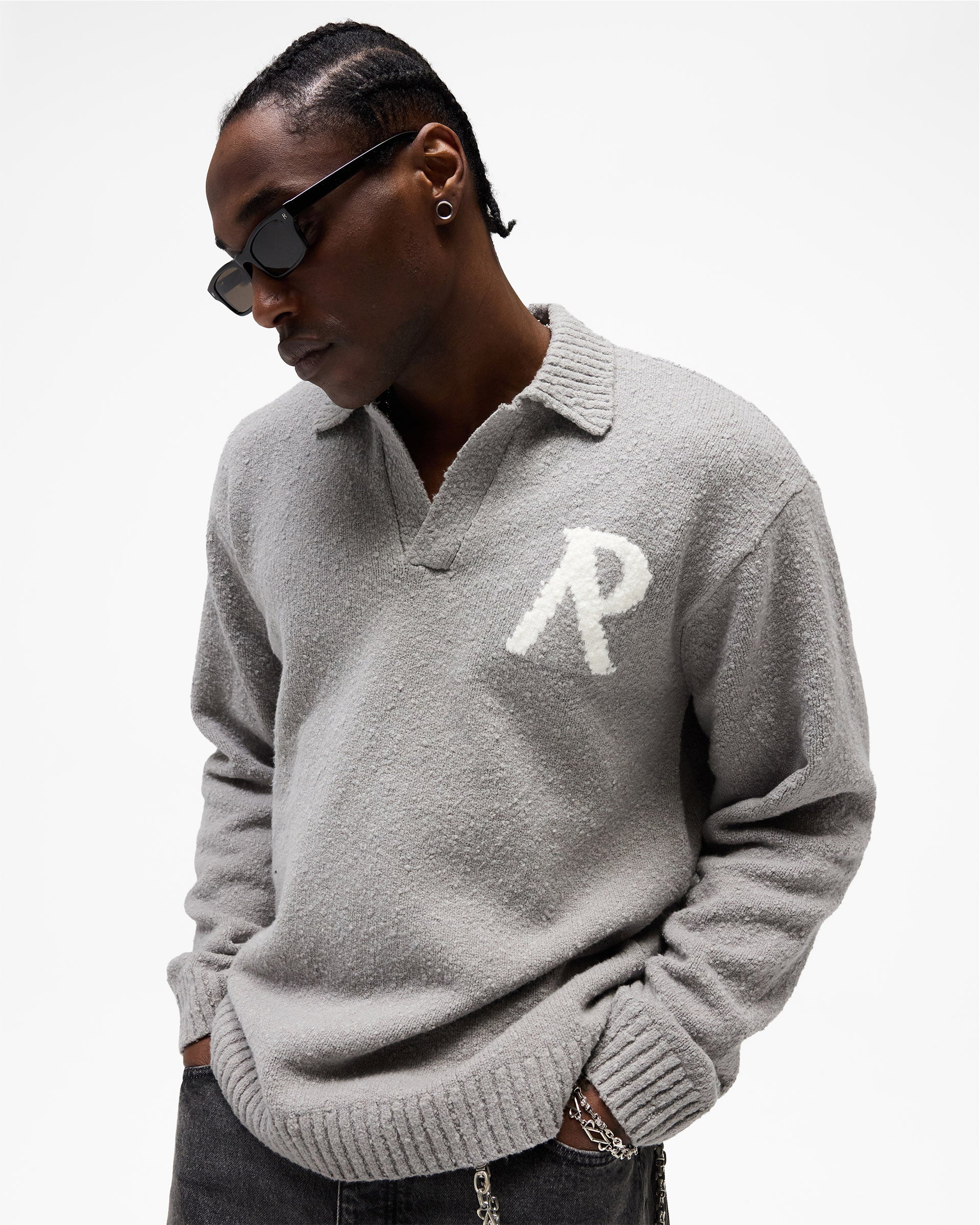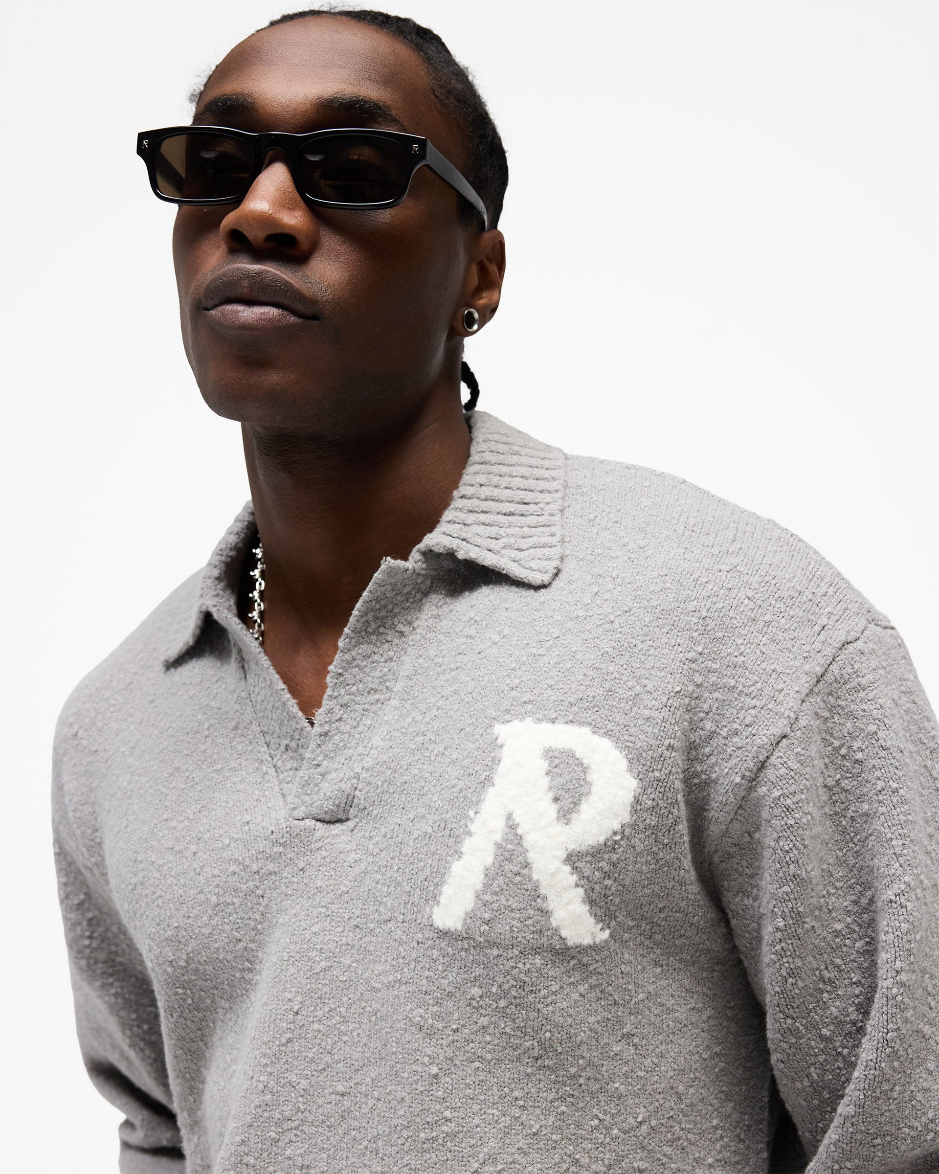 Introducing the Knitted Boucle Polo in Grey, a relaxed knitted polo crafted from a textured boucle yarn with a soft, tactile hand-feel. The open polo collar and V-neckline sit over a relaxed, oversized silhouette designed for effortless transitional layering.