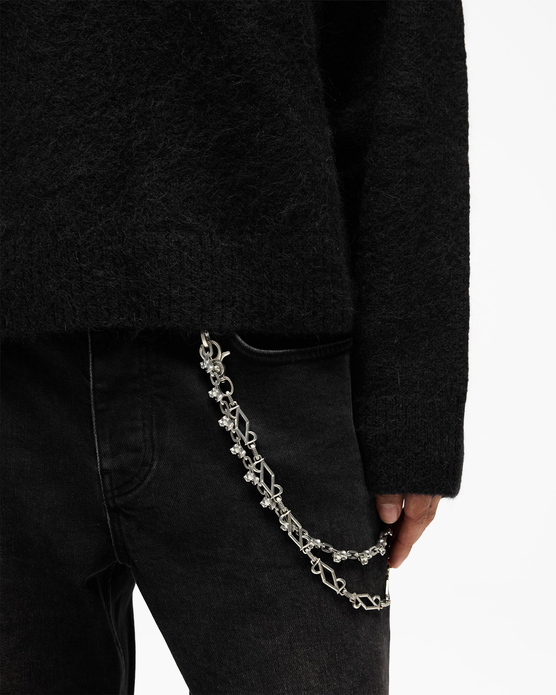 Introducing the Logo Knit Sweater in Jet Black, a relaxed crew neck sweater crafted from a brushed knit yarn with a soft, textured hand-feel. The intarsia knit Represent initial sits in a contrast white tone to the left chest, adding a clean branding detail against the black base.
