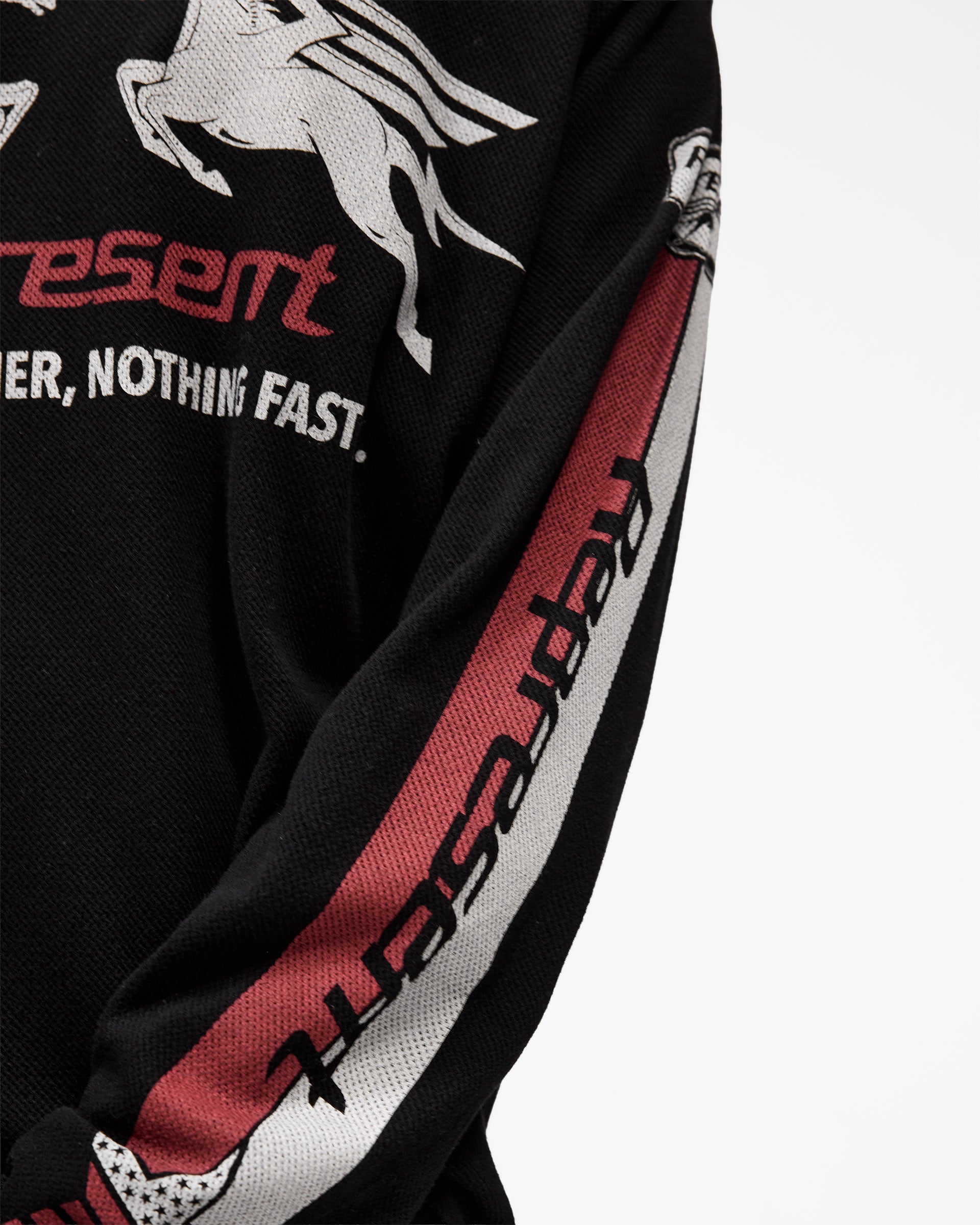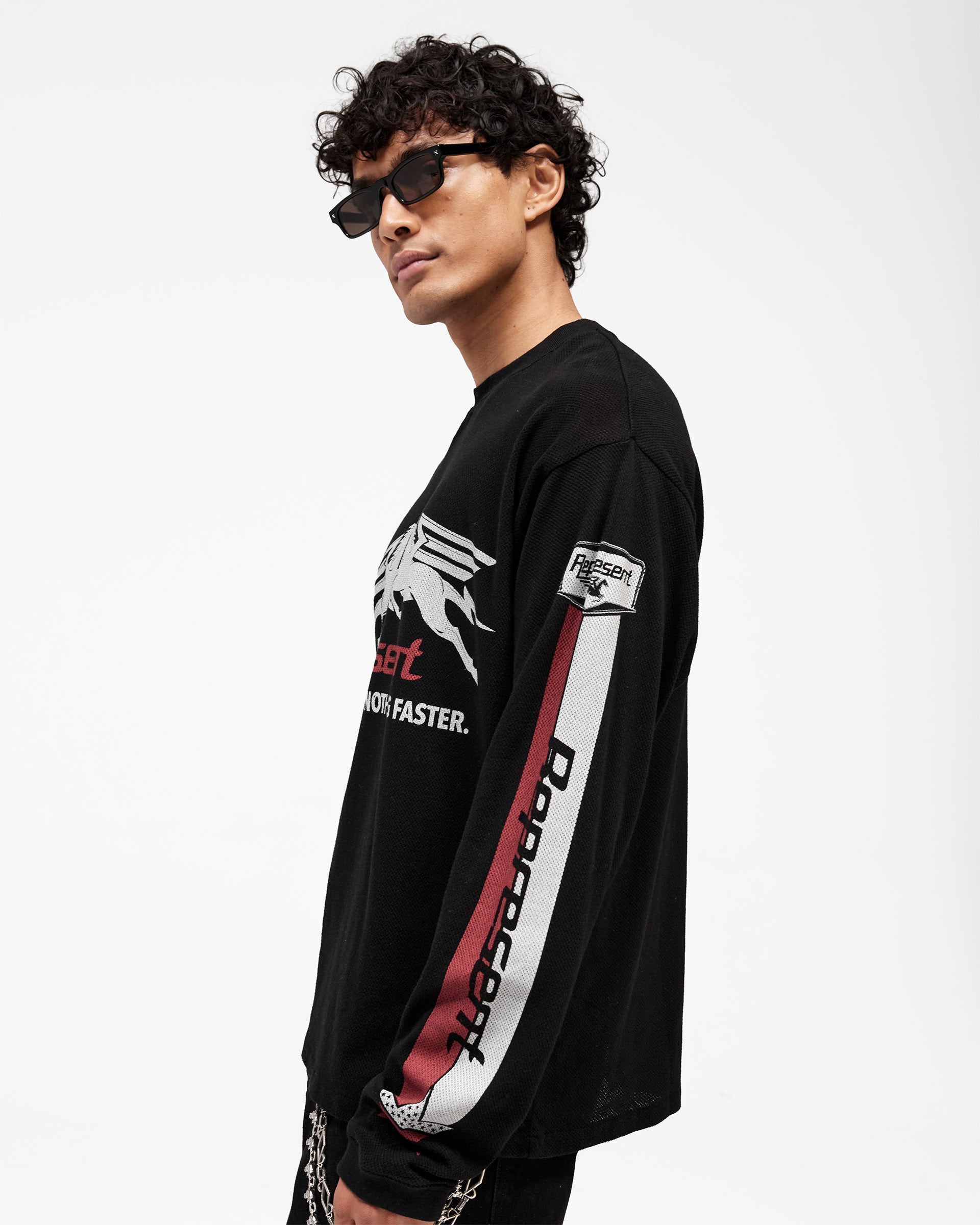 The construction embraces mixed textiles. The body is crafted from airy cotton mesh at 135GSM, allowing circulation without sacrificing structure. The rib collar combines 96% cotton with 4% elastane for gentle stretch and durability. A signature metal bar sits at the hem, and the front graphic is applied with precision. The regular fit long sleeve shape is designed to sit comfortably through layering or worn alone, with signature detailing that grounds the silhouette.