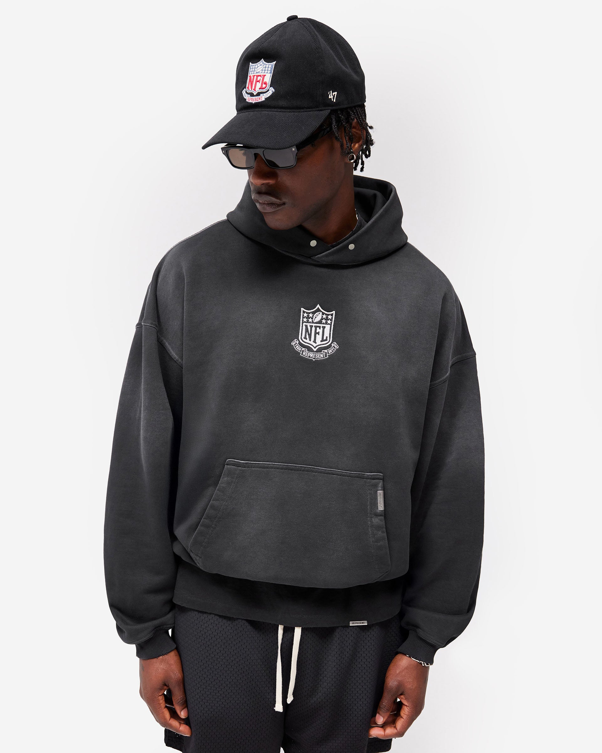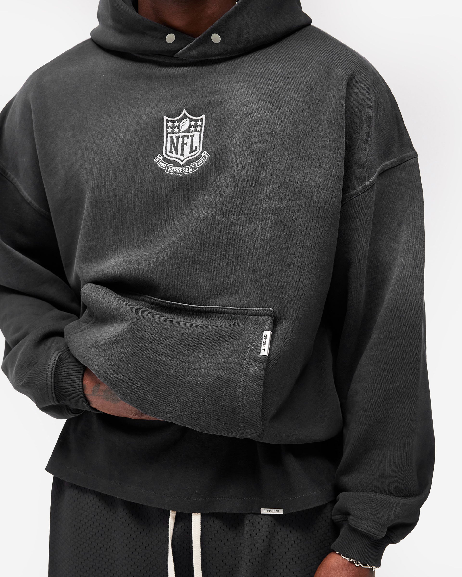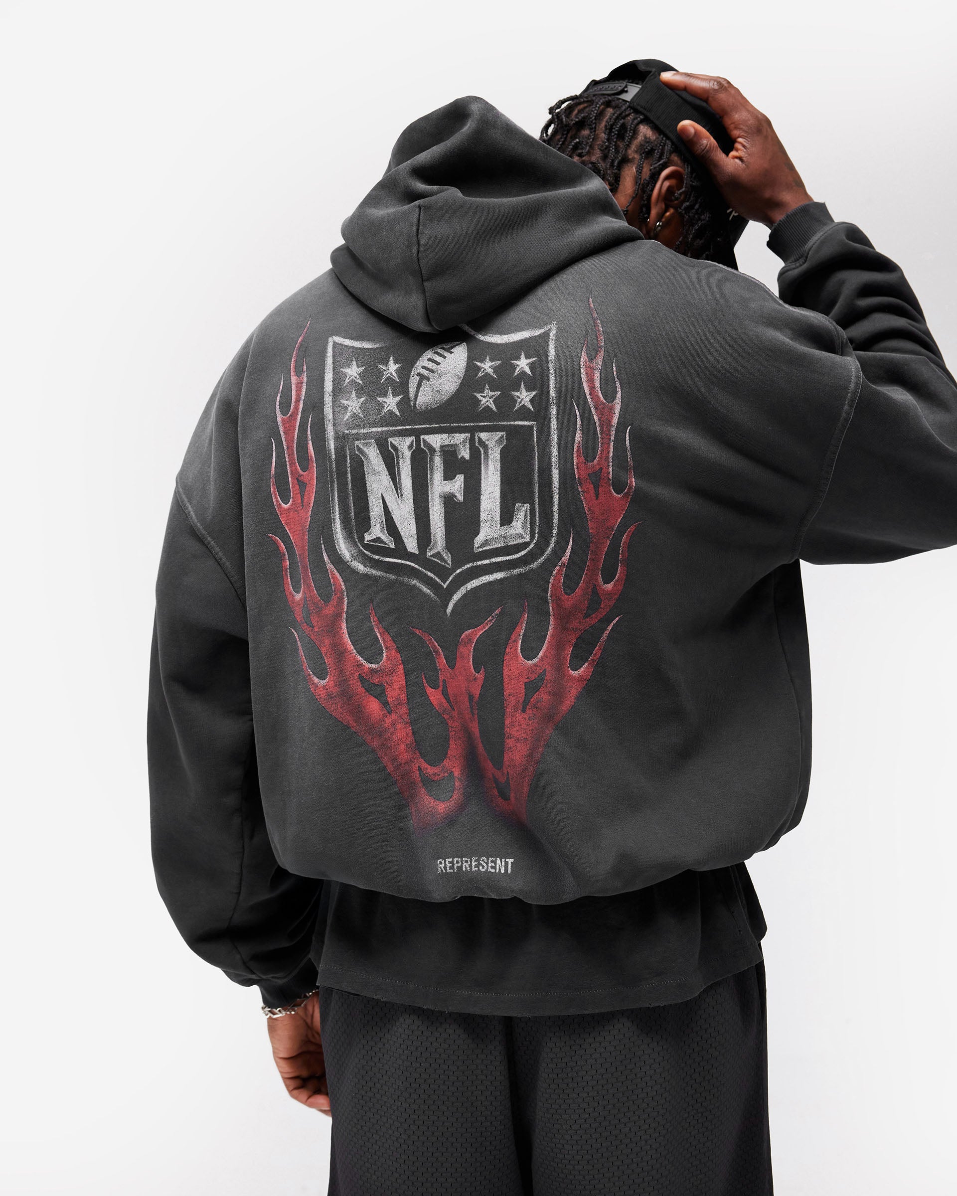 Introducing the NFL Shield x Represent Hoodie in Stained Black, a limited edition of 250 individually numbered pieces from Represent's first collaboration with the NFL, in partnership with Fanatics. Cut in an oversized 2.0 silhouette, this heavyweight hoodie is crafted from 485gsm cotton loopback fleece with a silicone wash and garment-dyed finish with a gradual spray for a naturally stained, worn-in feel. Embroidered NFL Shield branding sits central on the chest, with a water-based cracked screen print of the Shield engulfed in flames to the back. Minimal distressing and twin stitching construction build authentic character throughout.