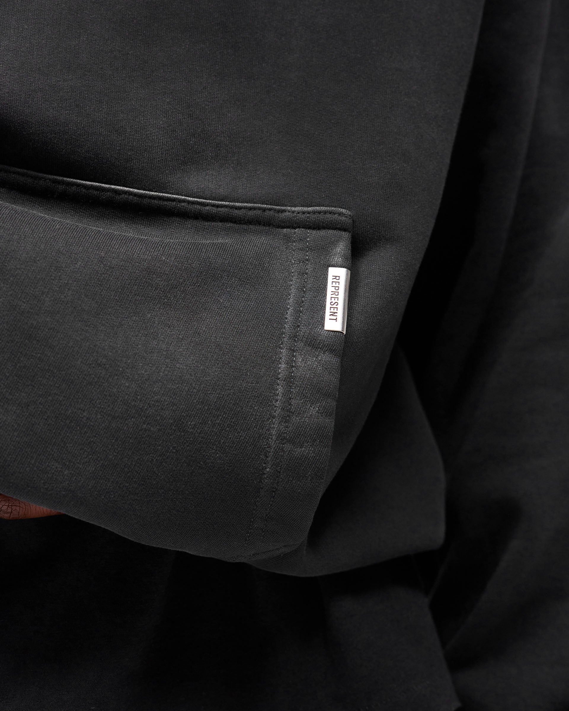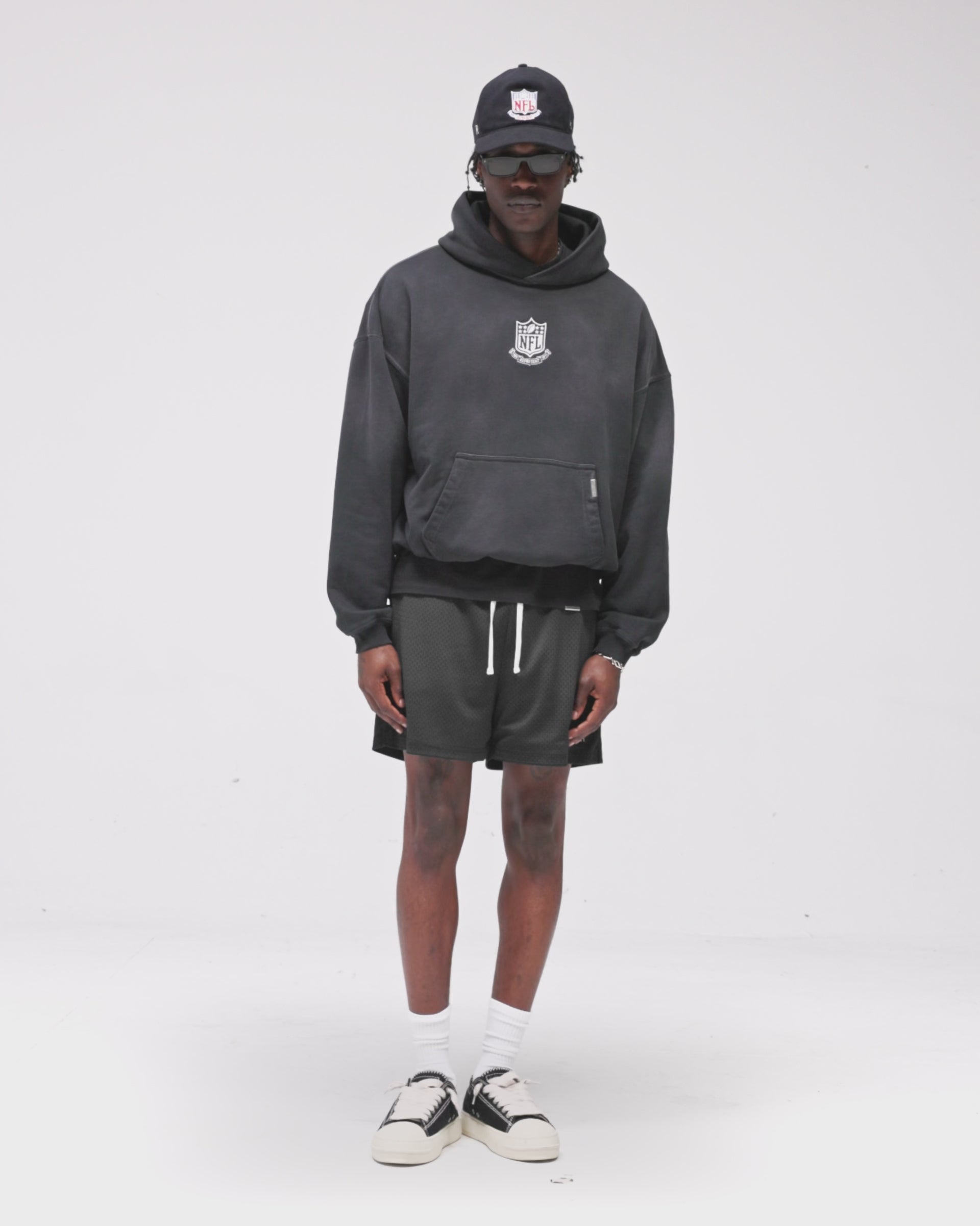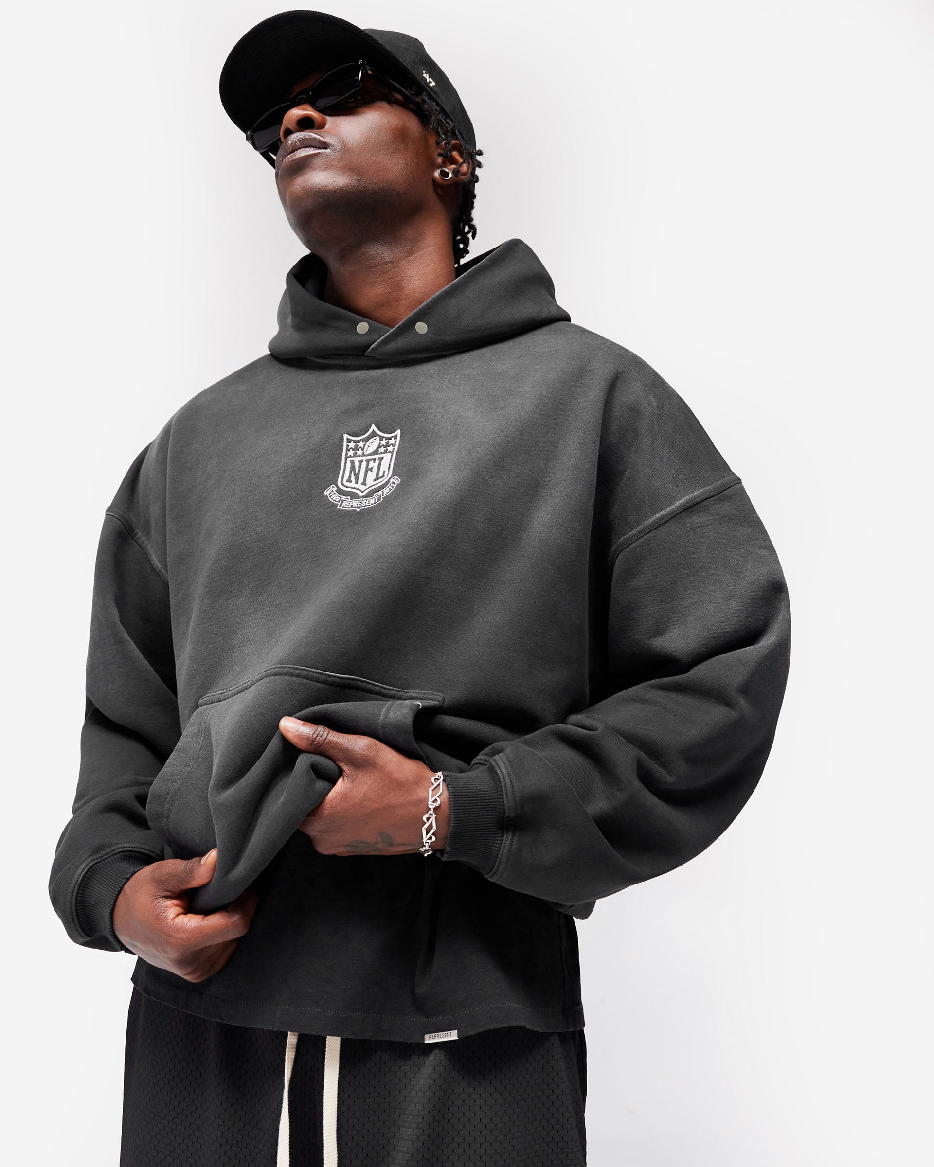 Introducing the NFL Shield x Represent Hoodie in Stained Black, a limited edition of 250 individually numbered pieces from Represent's first collaboration with the NFL, in partnership with Fanatics. Cut in an oversized 2.0 silhouette, this heavyweight hoodie is crafted from 485gsm cotton loopback fleece with a silicone wash and garment-dyed finish with a gradual spray for a naturally stained, worn-in feel. Embroidered NFL Shield branding sits central on the chest, with a water-based cracked screen print of the Shield engulfed in flames to the back. Minimal distressing and twin stitching construction build authentic character throughout.