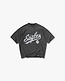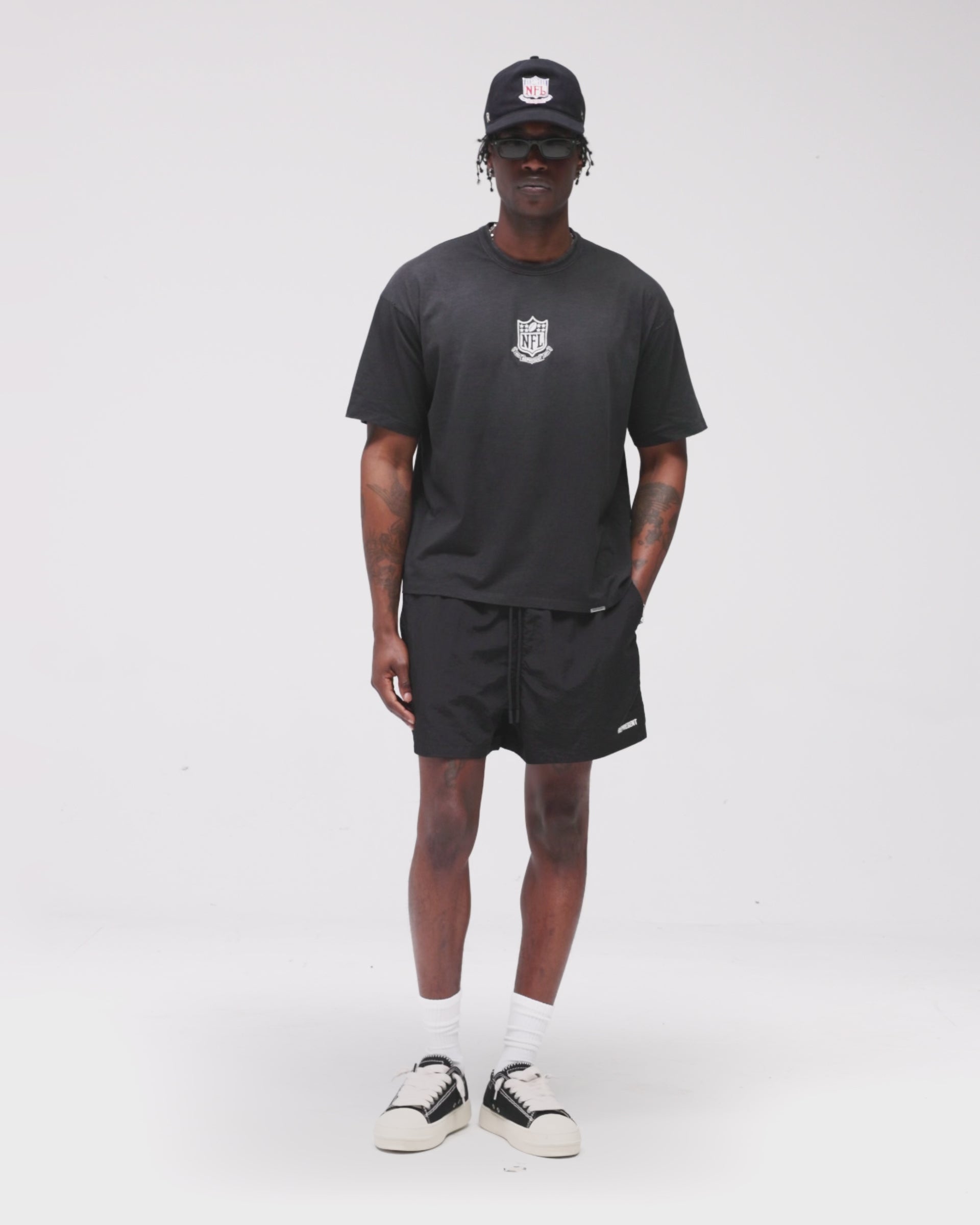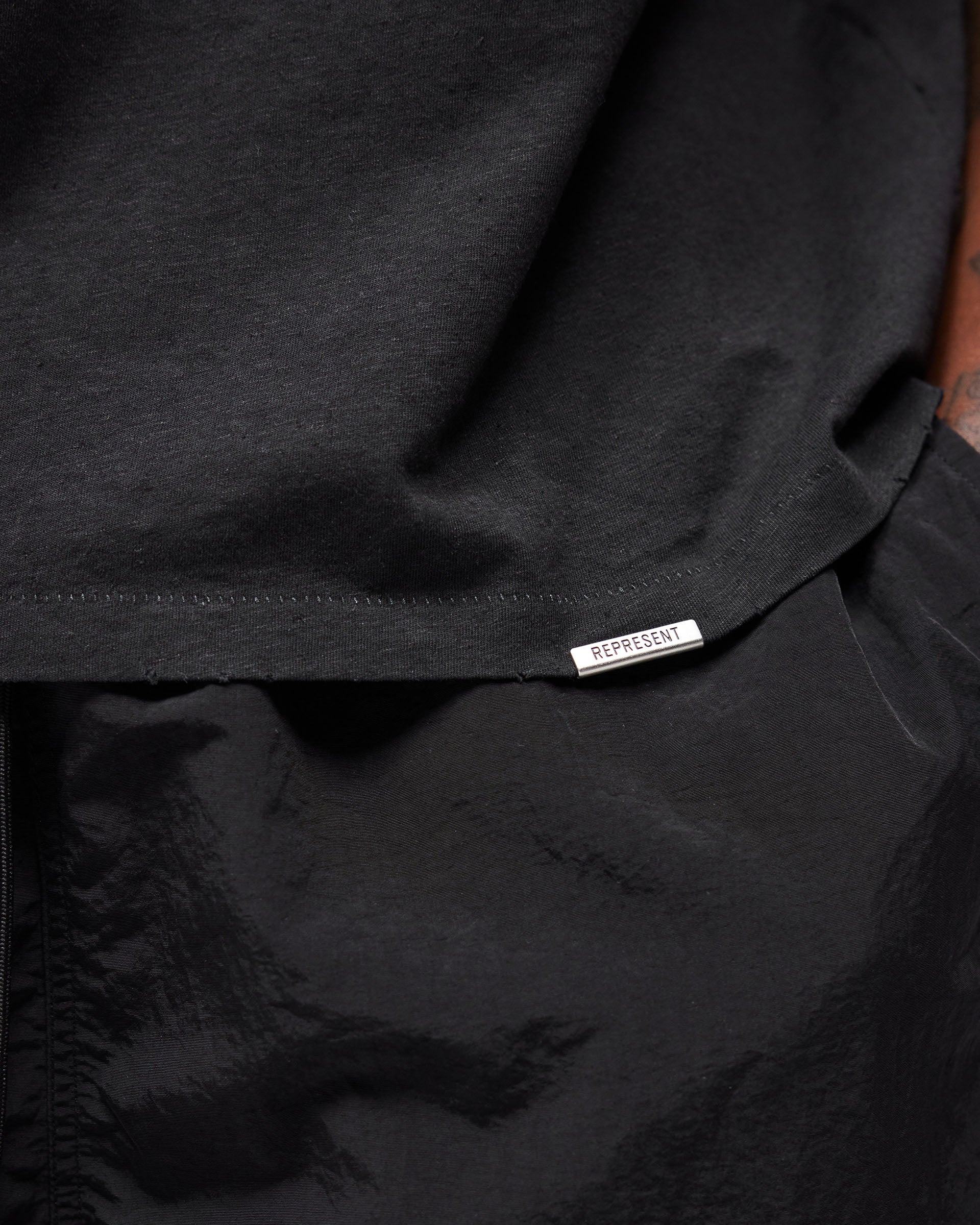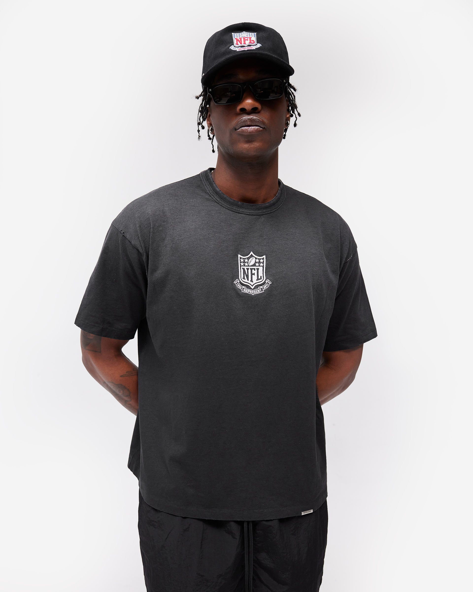 Introducing the NFL Shield x Represent T-Shirt in Stained Black, part of Represent's first collaboration with the NFL, in partnership with Fanatics. Crafted from 160gsm cotton-hemp slub jersey with a garment-dyed base and gradual spray finish, this oversized tee features embroidered NFL Shield branding to the chest and a water-based cracked screen print of the Shield engulfed in flames to the back. Minimal distressing at the collar, cuffs, hems, armholes and side seams builds authentic character, while ladder stitch detailing and a signature Represent metal bar bring considered construction throughout.