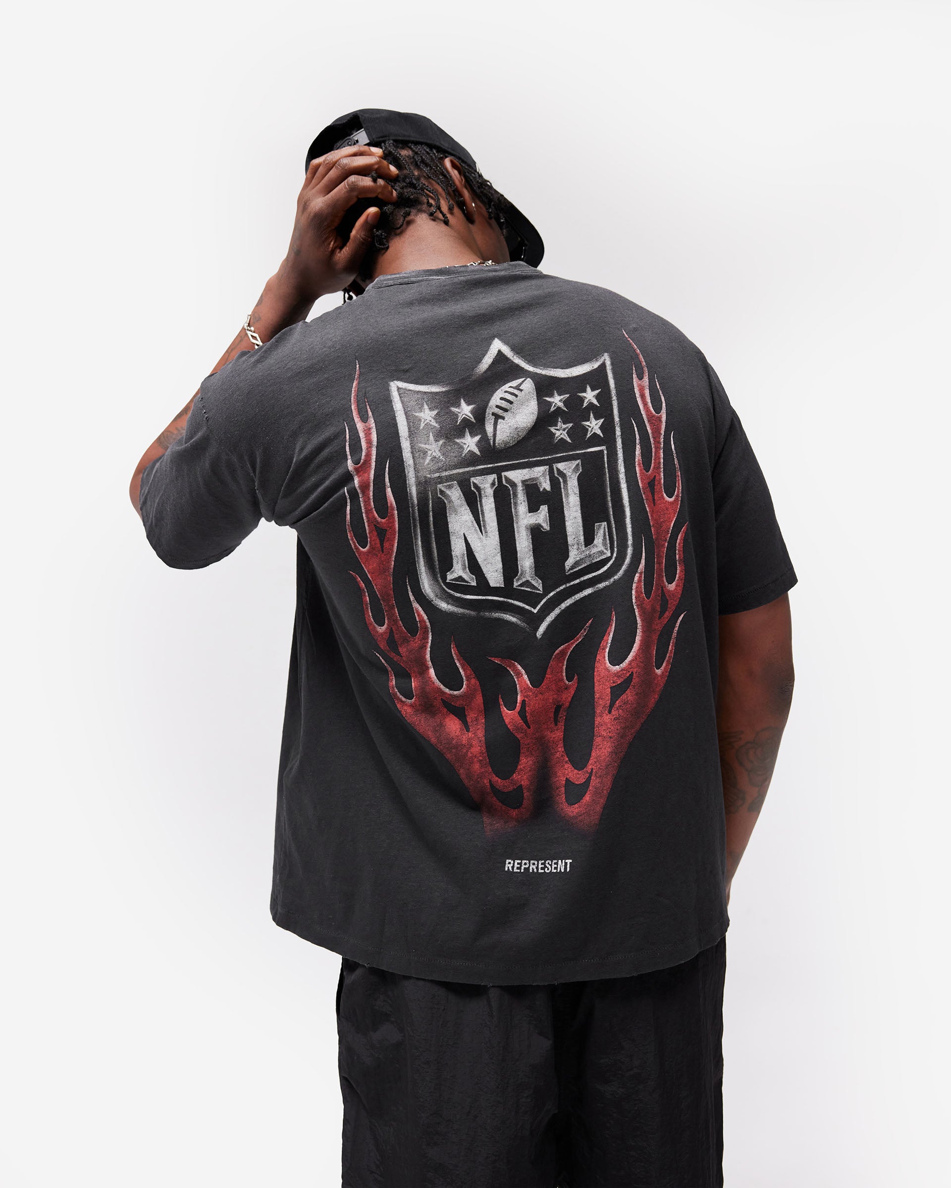 Represent x NFLFirst collaboration between Represent and the National Football League, in partnership with Fanatics.Cotton-Hemp Slub Jersey160gsm garment-dyed fabric with minimal distressing for authentic character.Embroidered Shield BrandingNFL Shield embroidery to the chest.Flames GraphicWater-based cracked screen print of the Shield engulfed in flames to the back.Signature ConstructionLadder stitch hem and cuff detail with Represent metal bar finishing.