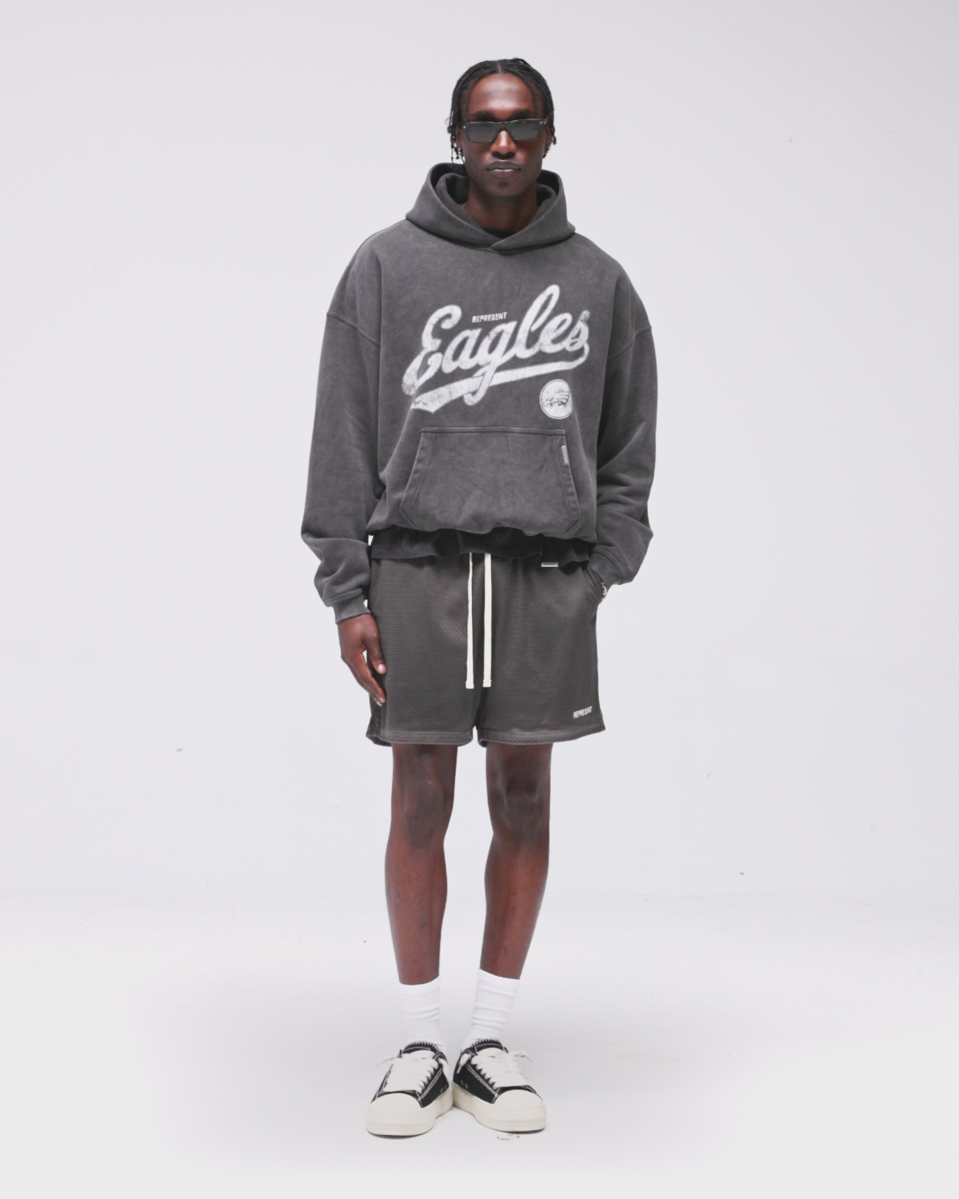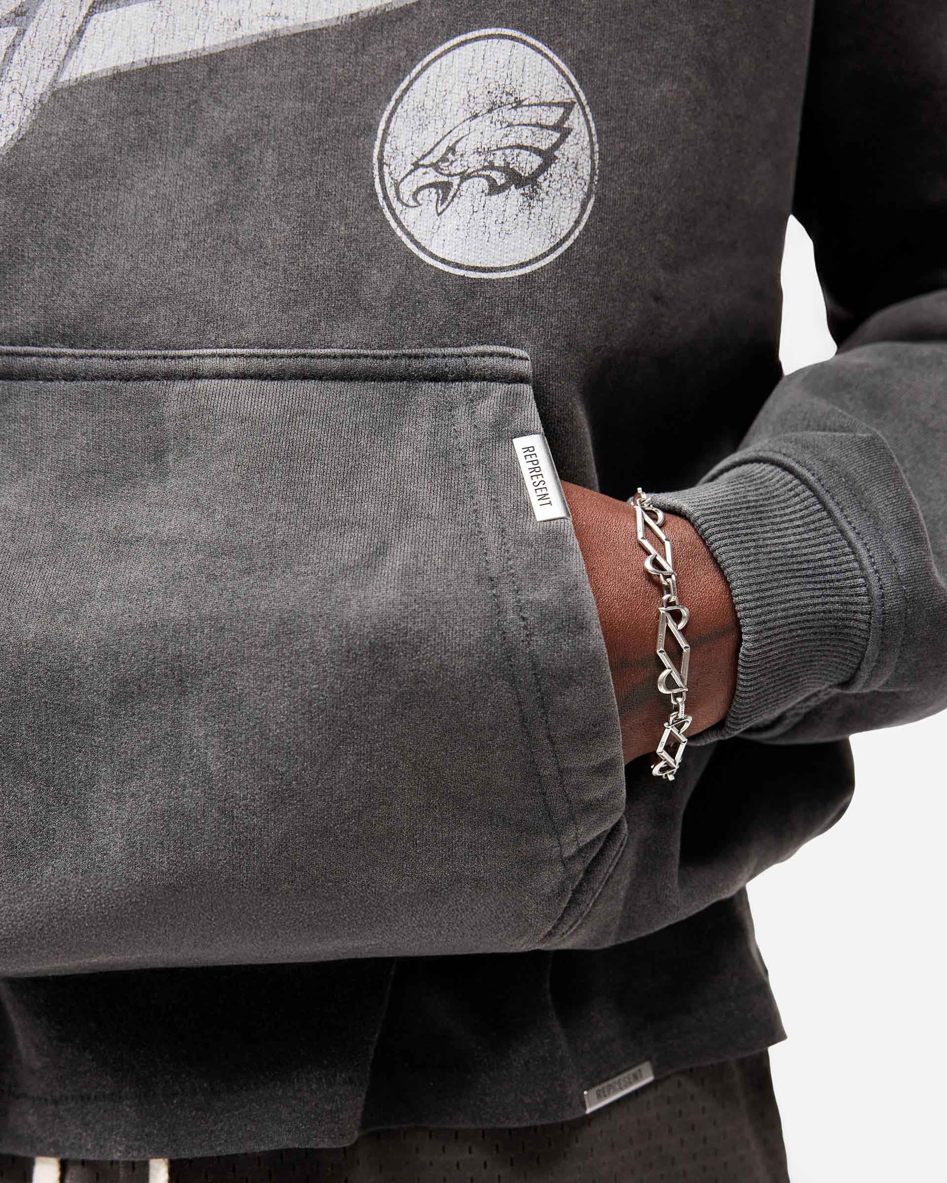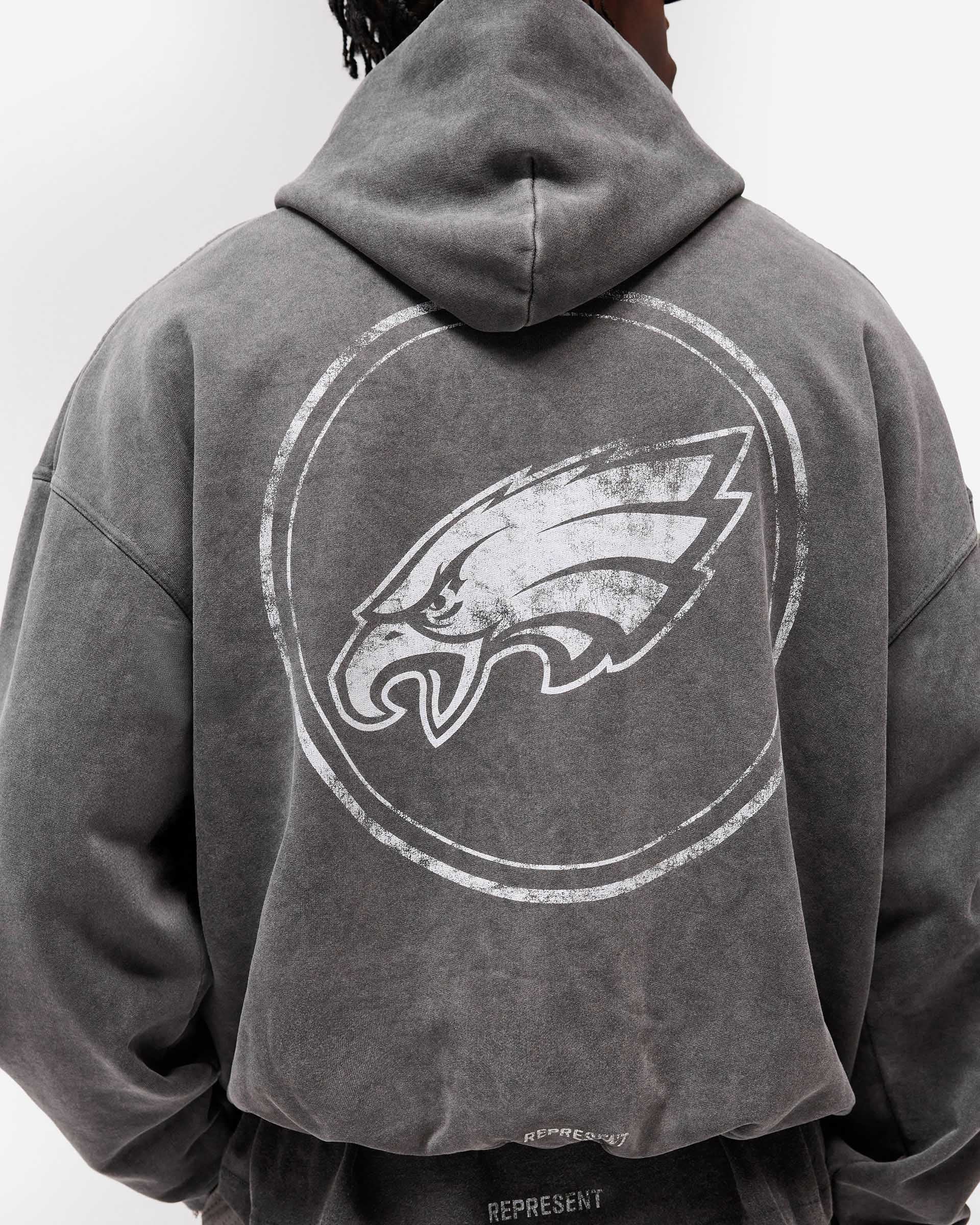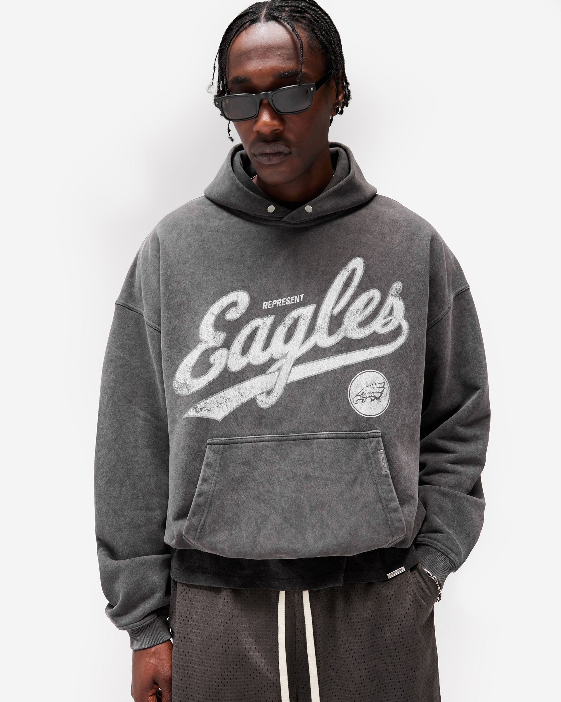 Represent x NFLFirst collaboration between Represent and the National Football League, in partnership with Fanatics.Heavyweight Loopback Fleece485gsm cotton with silicone wash for a naturally faded, vintage finish.Eagles Screen PrintWater-based graphics with script branding and circular logo patch.Twin Stitch ConstructionDouble-layer hood with Cobrax popper and Represent metal bar finishing.