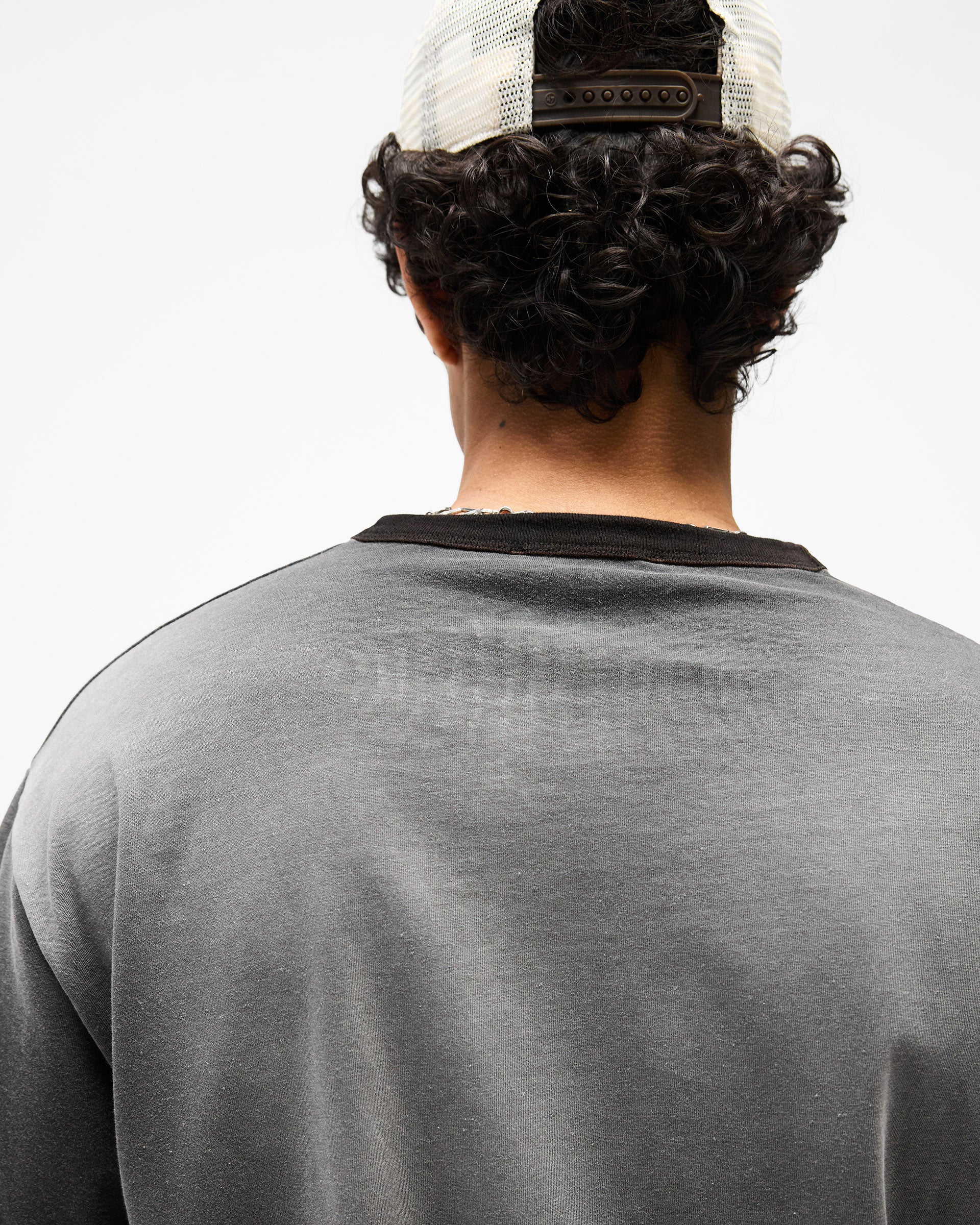 Construction details matter. A signature metal bar anchors the hem, whilst ribbed cuffs and hem provide definition. Crafted from 100% cotton slub at 230GSM, the fabric has weight and texture that develops character with wear. The slub weave creates subtle dimensionality, and the natural fading process means this piece becomes more distinctive over time. The ringer silhouette is timeless, designed to sit close to the body in a traditional regular fit.